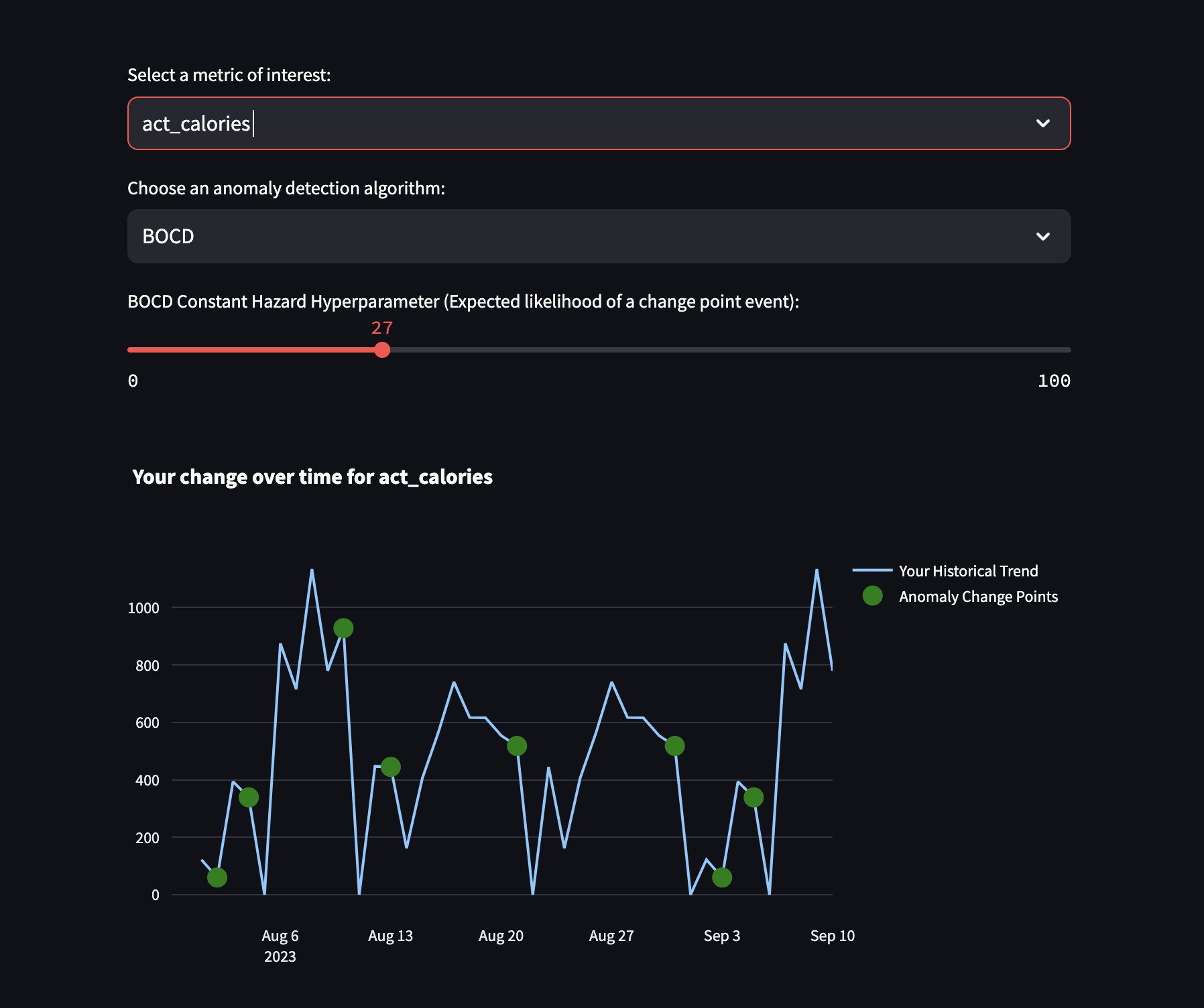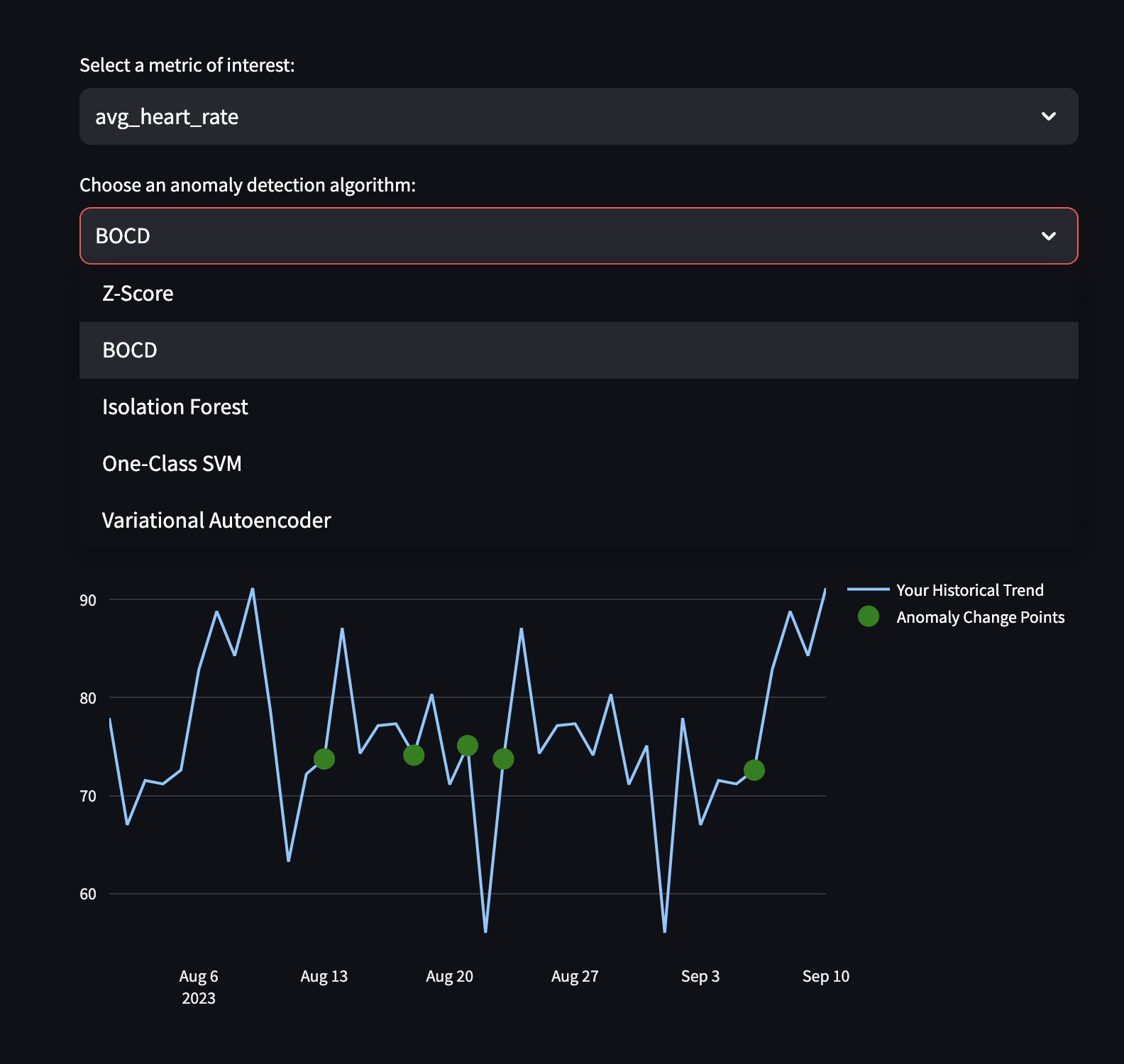 Anomaly Detection: The BOCD algorithm was implemented to perform real-time anomaly detection on the time series health data.
