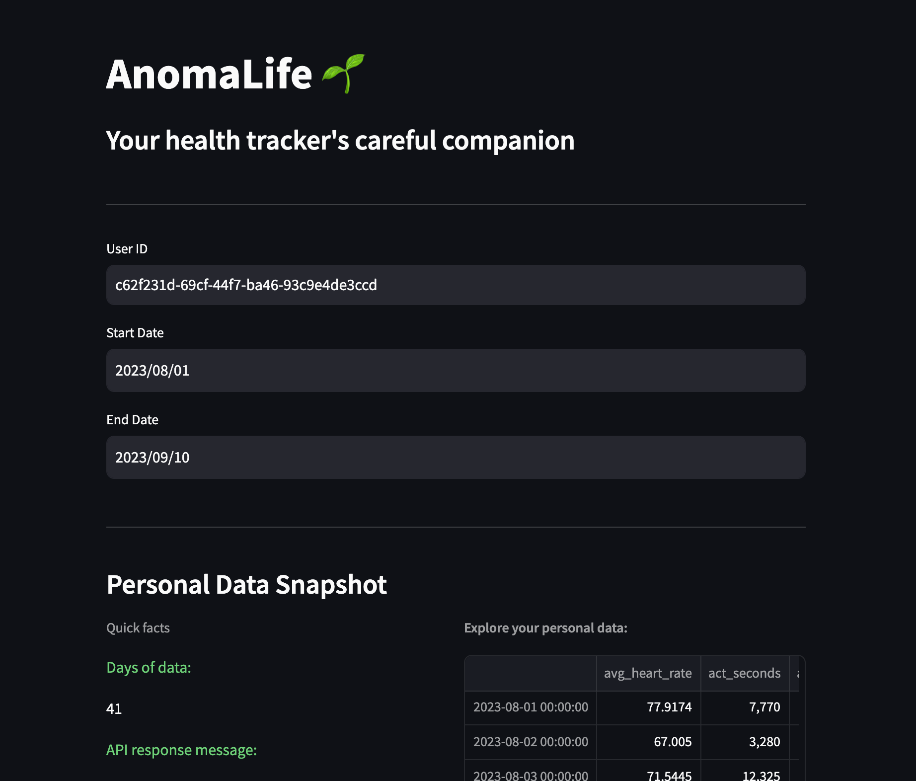 User Interface: The project includes an intuitive web interface developed using Streamlit. This interface enables users to interact with their health data, view time series visualizations using the Plotly library, and customize anomaly detection settings.