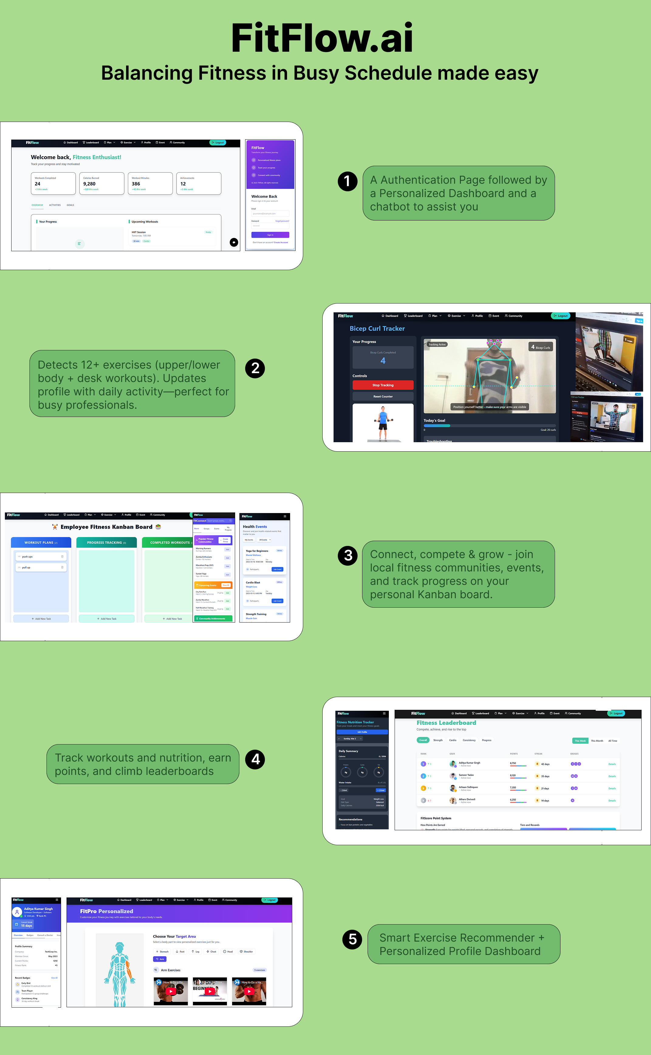 FitFlow.ai was born out of the need to make fitness more accessible, safer, and effective for everyone, no matter where they are. The increasing demand for personalized fitness solutions and the challenges people face with traditional gym memberships and schedules led us to think about a better way. The result is an AI-powered platform that provides real-time form correction and personalized workouts using only your device's camera.