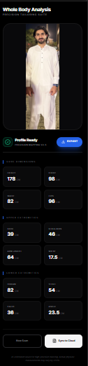 Point your phone camera at yourself, and our AI-powered body scanning technology captures 15+ precise measurements in under 30 seconds. No tape measures, no awkward contortions - just stand naturally while our computer vision algorithms map your unique proportions with ±0.5cm accuracy. We don't just measure your chest and waist; we understand your shoulder slope, arm length, torso ratio, and the subtle details that make clothing fit you perfectly.