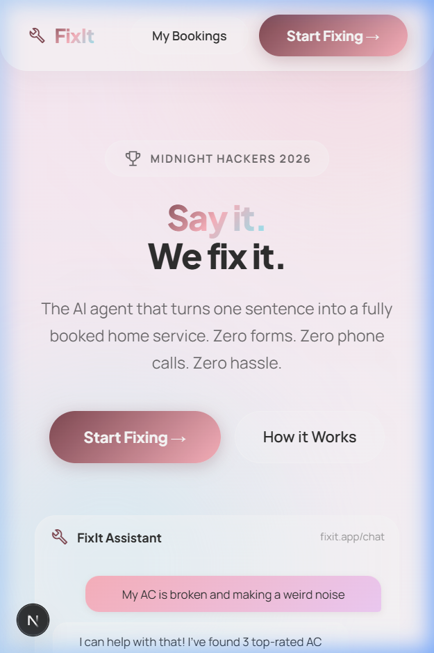 FixIt is an AI-powered home service booking agent. Users describe their problem in plain English, and the AI: