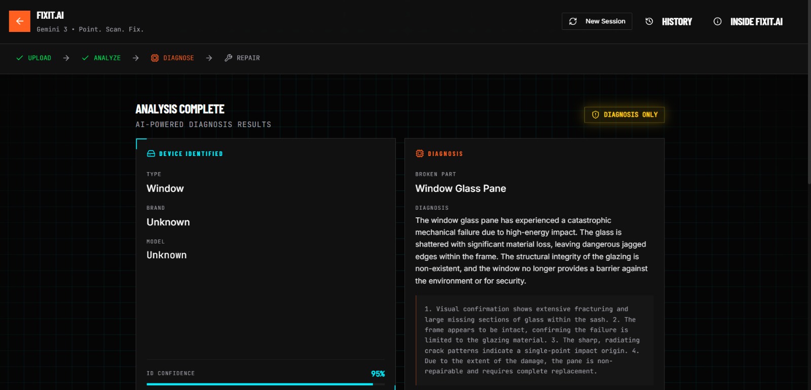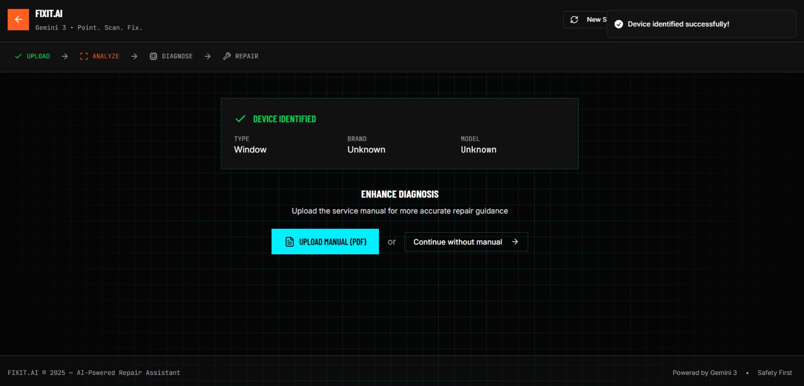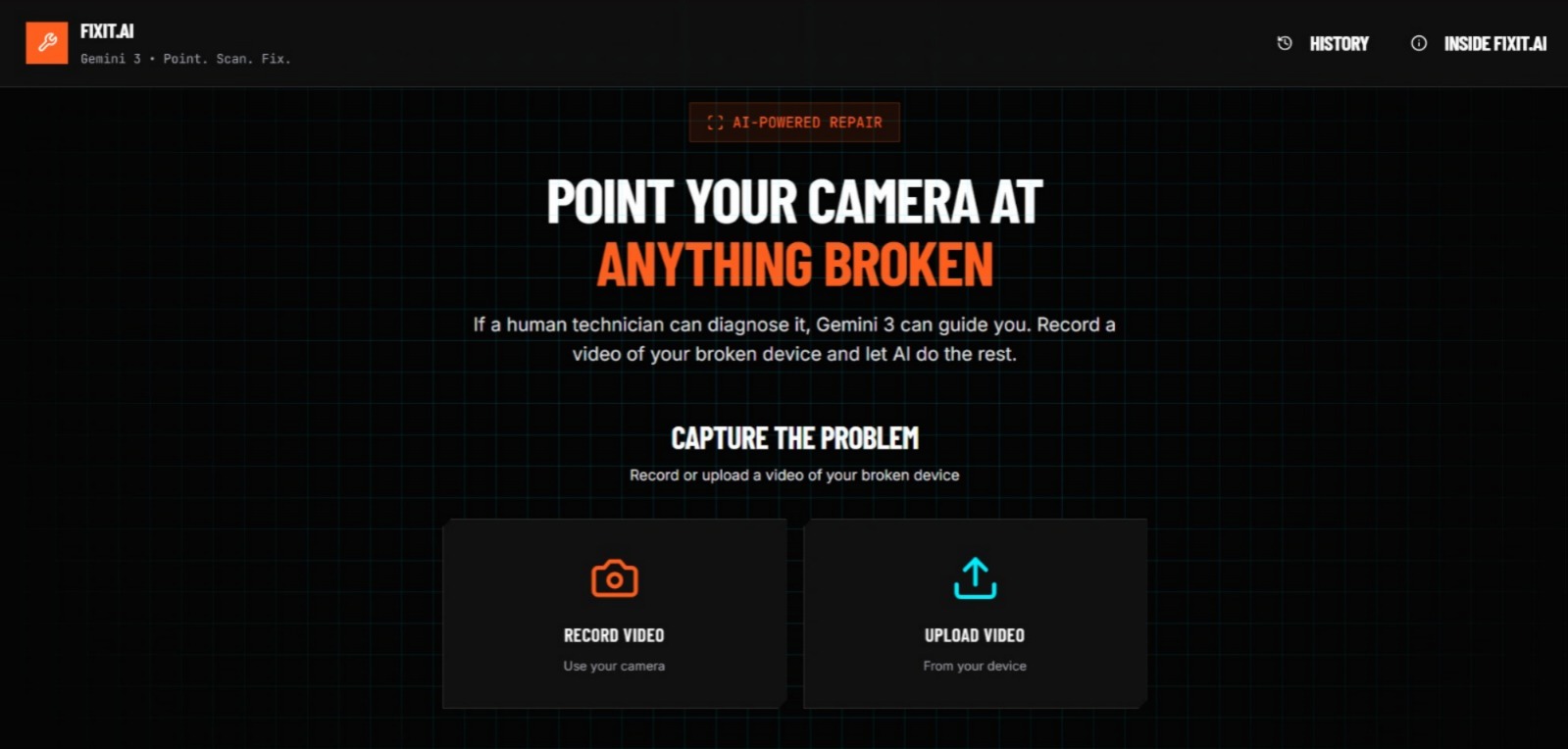 - Video Diagnosis: You upload a video of your broken device. FixIt.AI uses Gemini 3 to identify the exact make and model, and analyzes visual cues (like flickering lights, strange noises, or physical damage) to diagnose the problem.