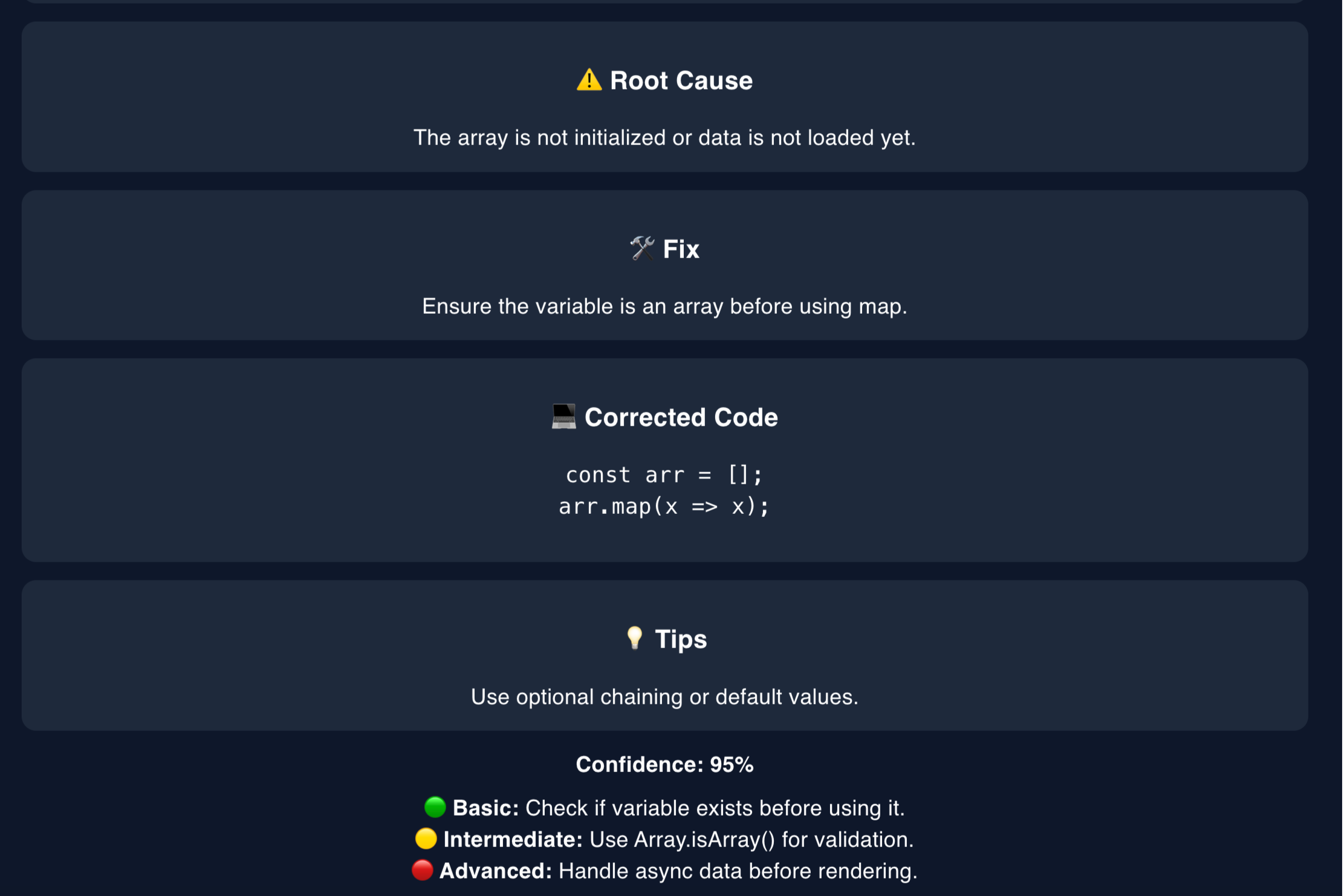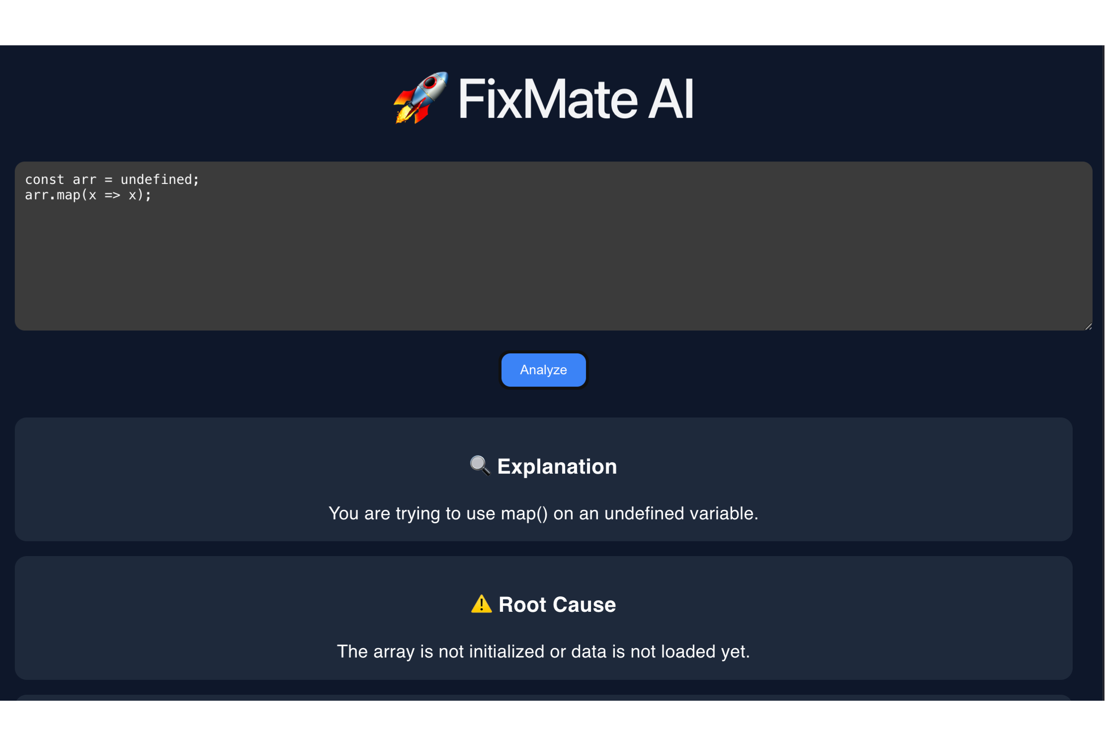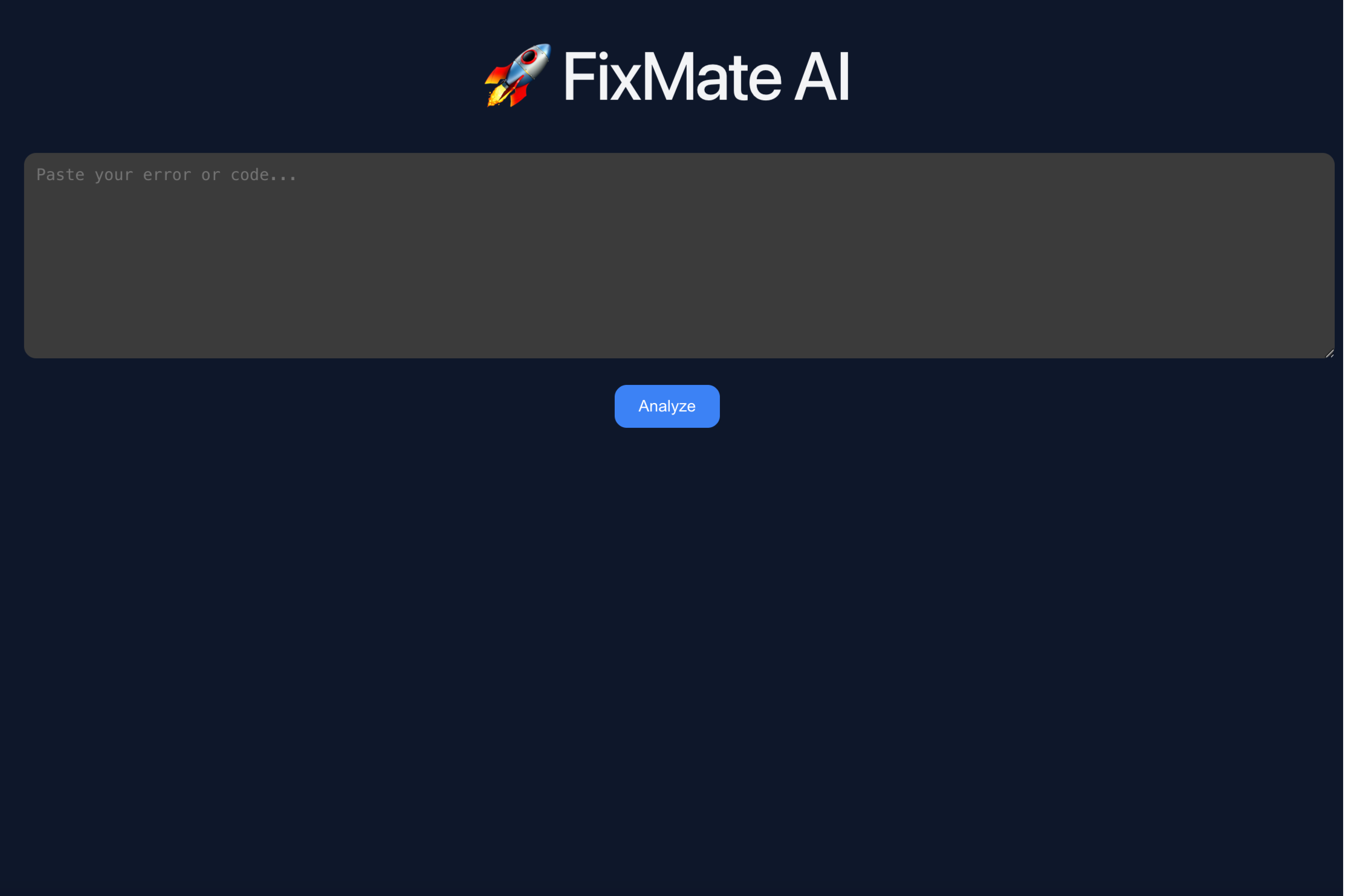 I independently designed and developed FixMate AI as a full-stack application. I worked on both the frontend and backend, building the user interface using React and implementing the server using Node.js and Express. I developed the core logic for analyzing errors, generating structured responses, and integrating AI-based reasoning. I also handled deployment, hosting the frontend on Vercel and the backend on Render, and ensured smooth communication between the two. This project helped me strengthen my understanding of full-stack development, API integration, and building user-focused AI tools.