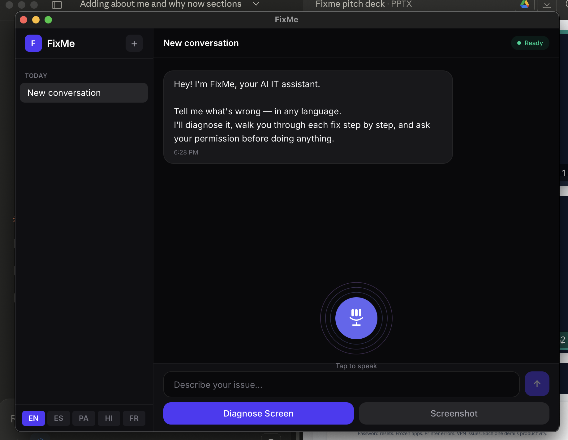 Accessibility-first design. Language barriers shouldn't mean tech barriers. FixMe speaks to users in their language and at their pace.