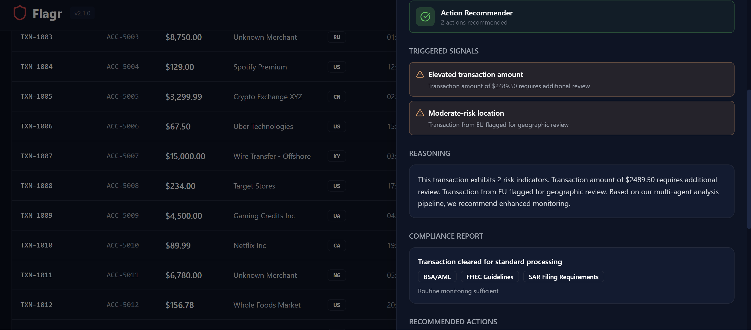 - Action Recommender tells the bank exactly what to do: APPROVE, REVIEW, or BLOCK, with account status and customer notification