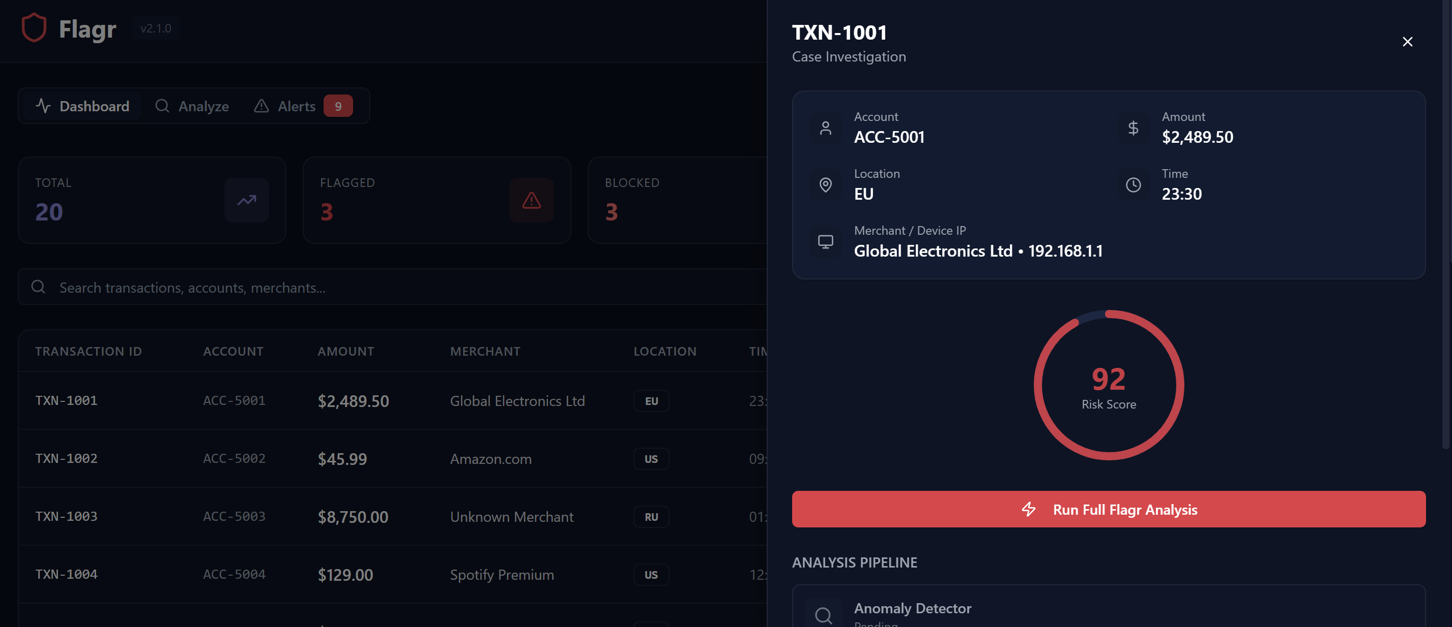 Flagr compliance dashboard — 20 transactions monitored in real time, risk scored and categorized automatically.