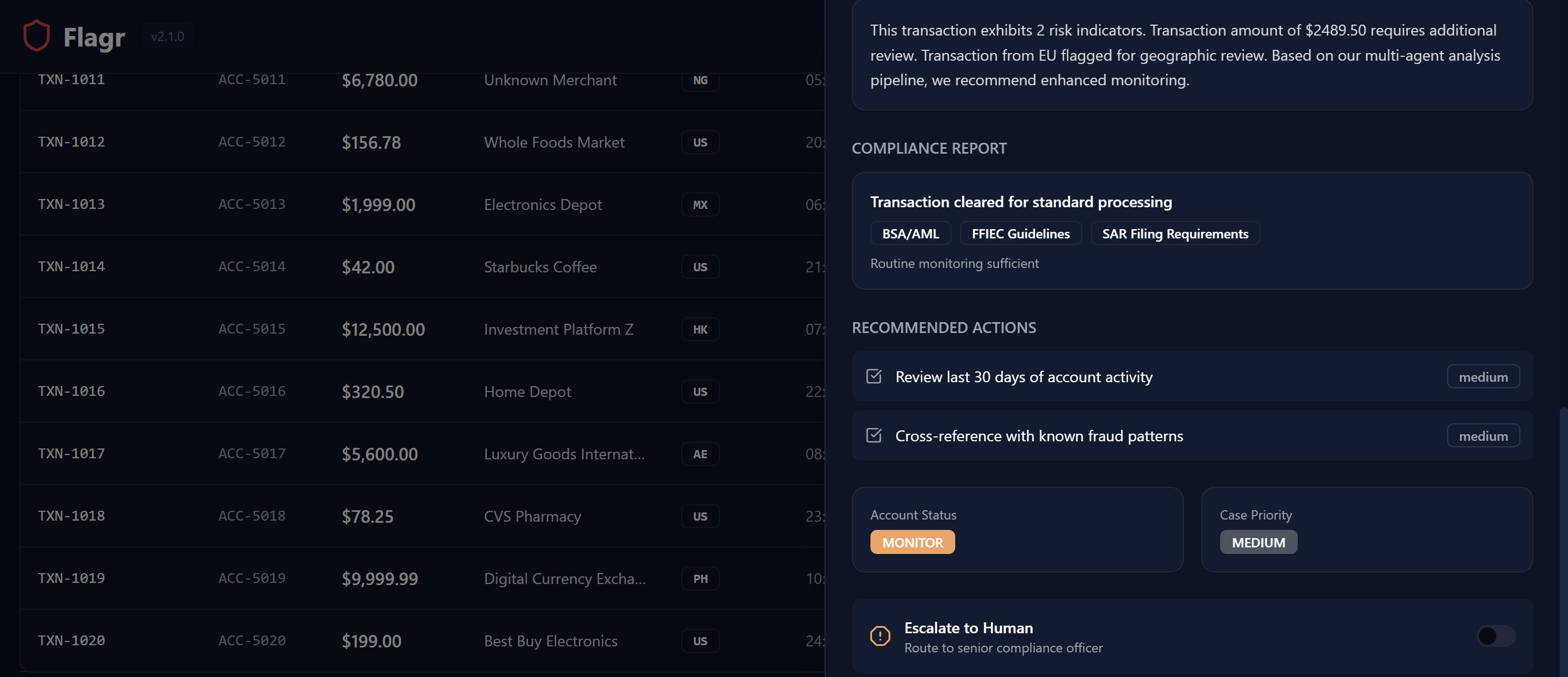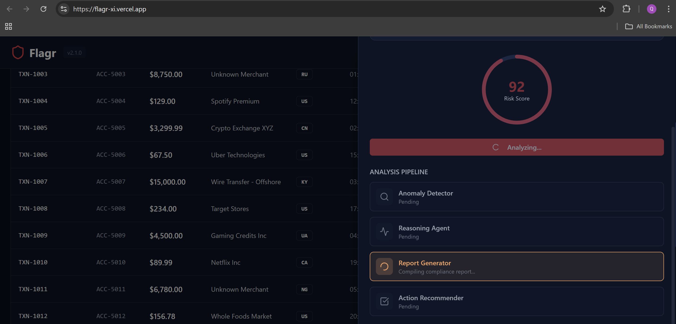 - Reasoning Agent explains in plain English why the transaction is suspicious