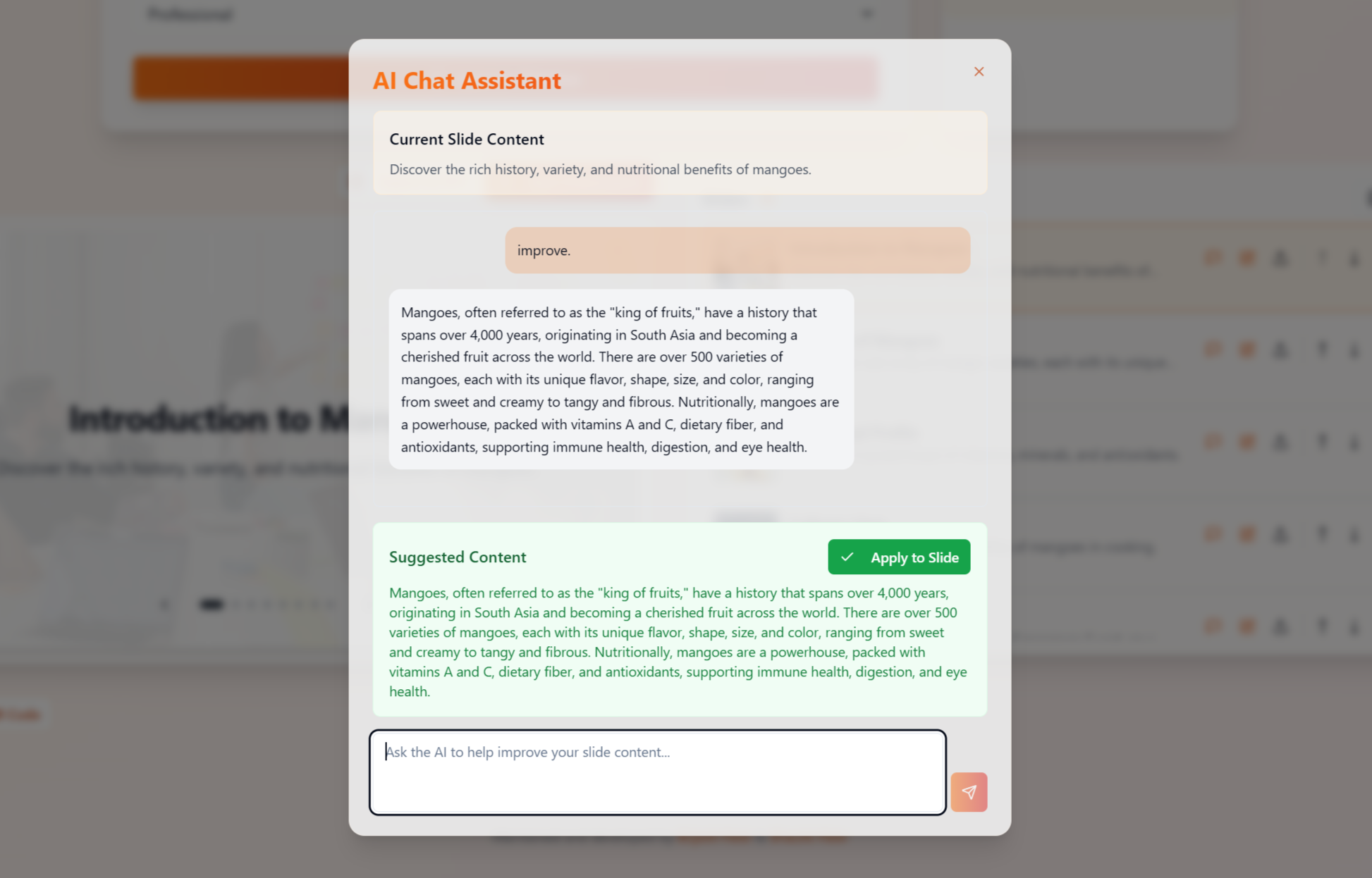 FlamSlides transforms a simple topic and description into a complete, professional presentation. Using GPT-4, it generates engaging content while DALL-E 3 produces stunning visuals automatically. With an interactive chat interface for fine-tuning, real-time previews, and an auto-playing slideshow feature, it delivers modern, responsive slides without the hassle of manual formatting.