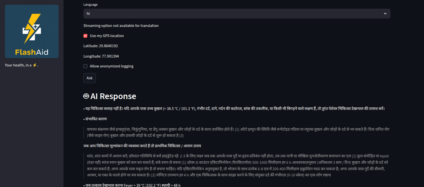 Flash Aid is an AI-powered emergency assistant designed to deliver instant, accessible medical guidance during critical moments. It streams clear instructions in English while also providing direct translations into local languages—ensuring no one is left behind due to language barriers.