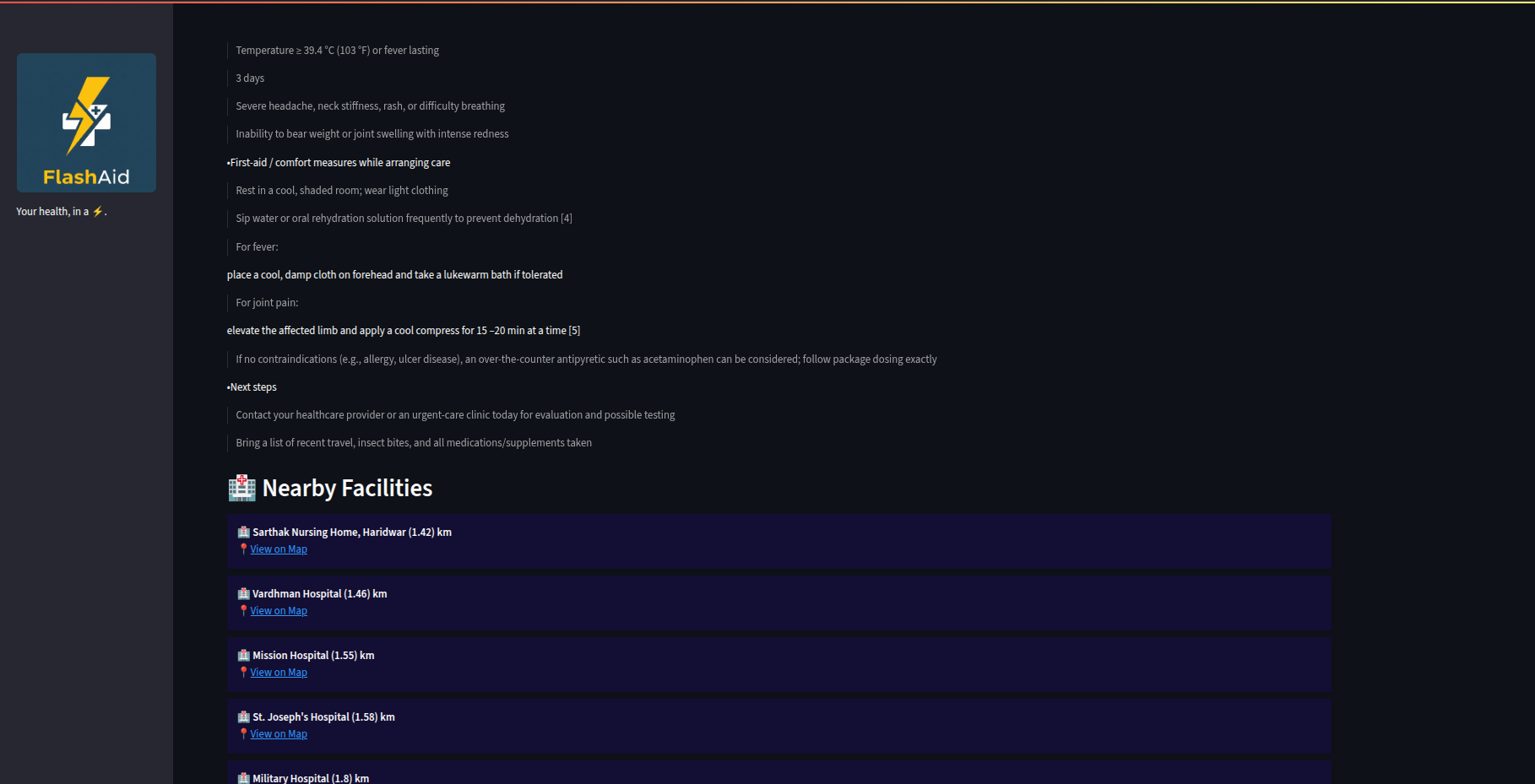 -Suggests nearby medical facilities using location data + OpenStreetMap.