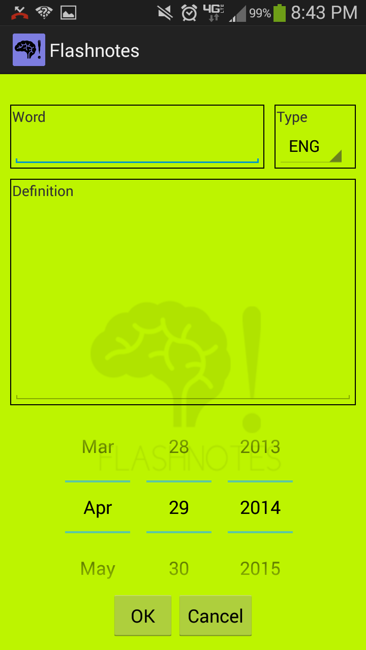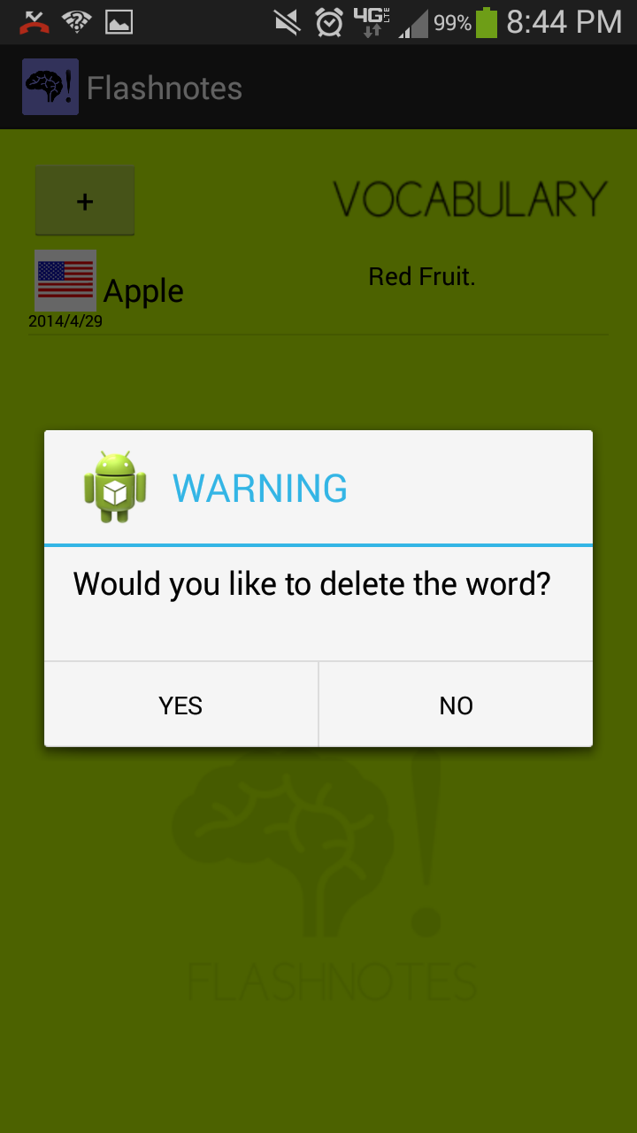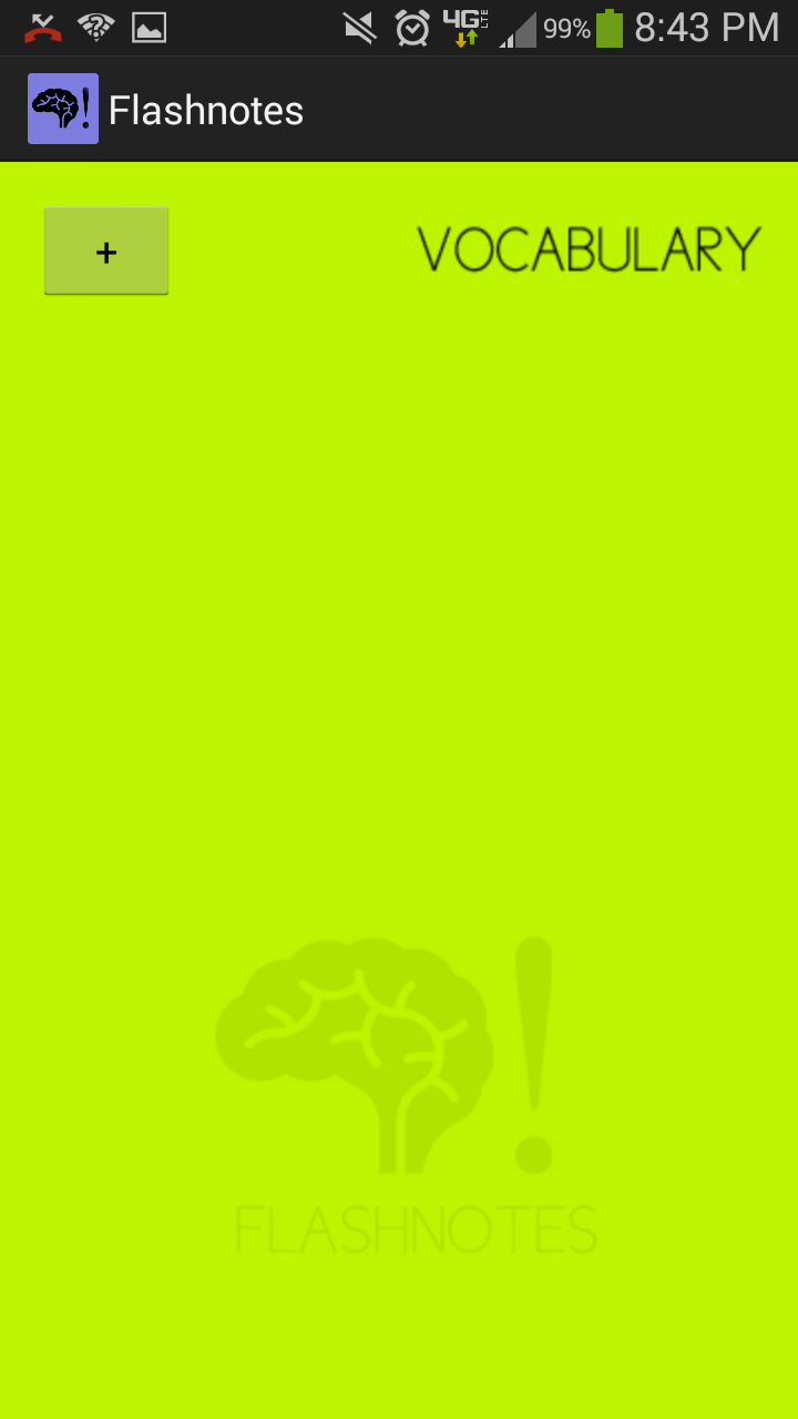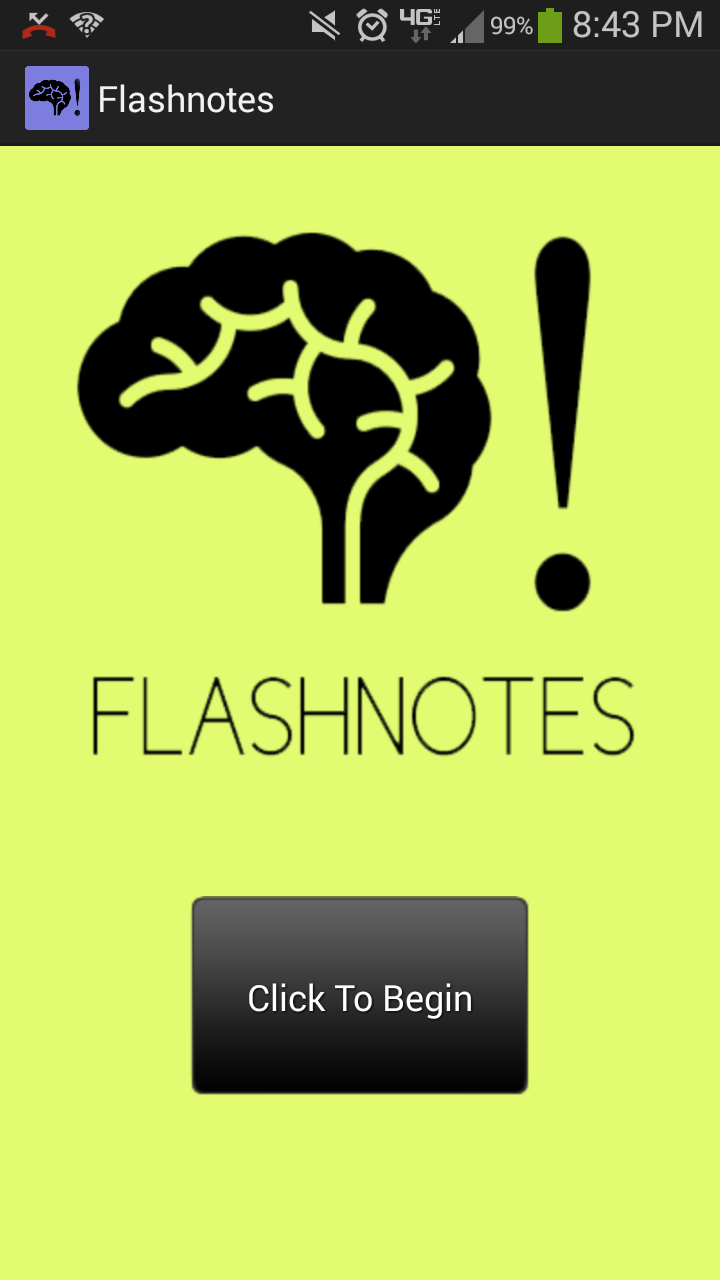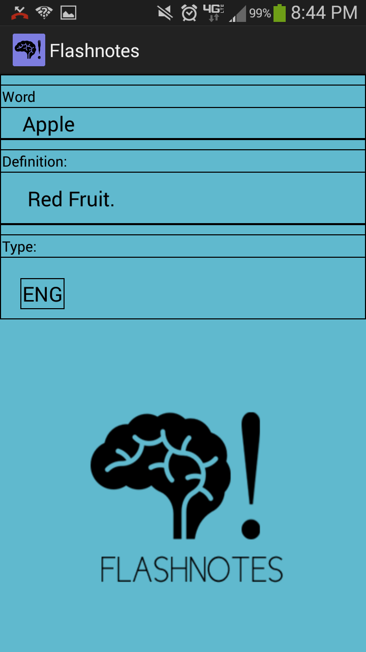 FlashNotes is a simple, on-the-go, vocabulary app. At the current moment, a variety of standardized tests such as the APs and the SATs forces students to require a efficient way to memorize vocabulary. FlashNotes is able to serve this role. It's bootup speed is 43 times faster than that of the standard vocabulary app, maximizing the productivity necessary for students. In addition, it's simple user interface makes the application easy to utilize.