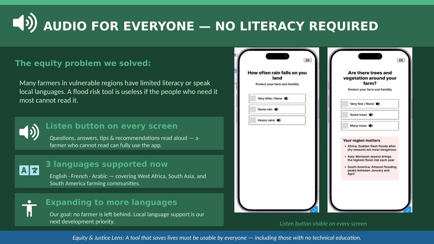 Audio Feature: No Literacy Required Many farmers in vulnerable regions have limited literacy or speak local languages that differ from written ones. A flood risk tool is useless if the people who need it most cannot read it. That is why we added a Listen button on every screen of the app. By pressing it, users hear all questions, answers, tips, and recommendations read aloud, so a farmer who cannot read can fully use the app and understand exactly what risk they face and what steps to take. We currently support English, French, and Arabic. Our goal is to expand to Hindi, Swahili, Bengali, and Spanish, covering the largest farming populations in our three target regions.