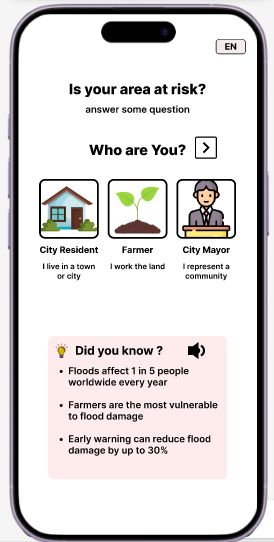 Audio Feature: No Literacy Required Many farmers in vulnerable regions have limited literacy or speak local languages that differ from written ones. A flood risk tool is useless if the people who need it most cannot read it. That is why we added a Listen button on every screen of the app. By pressing it, users hear all questions, answers, tips, and recommendations read aloud, so a farmer who cannot read can fully use the app and understand exactly what risk they face and what steps to take. We currently support English, French, and Arabic. Our goal is to expand to Hindi, Swahili, Bengali, and Spanish, covering the largest farming populations in our three target regions.