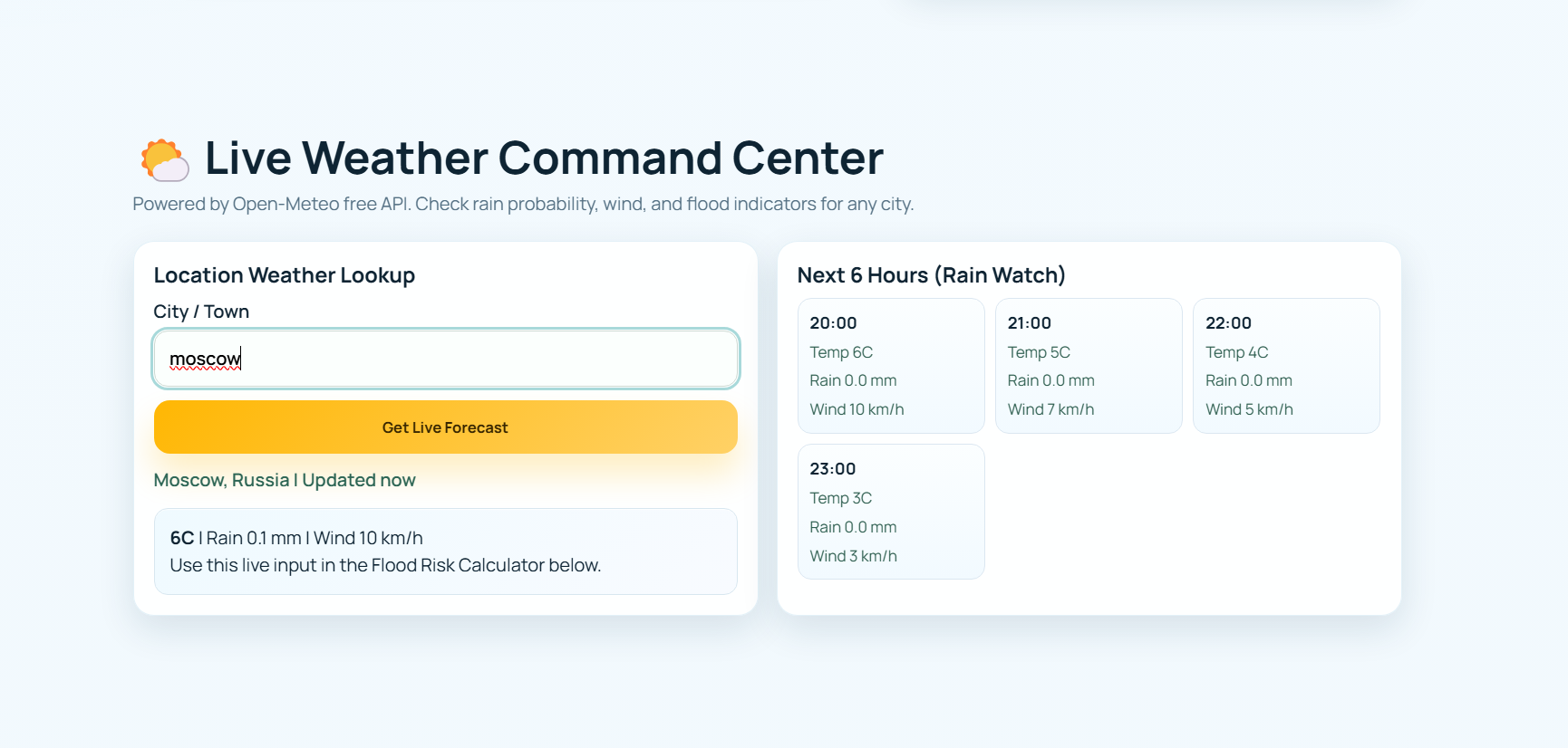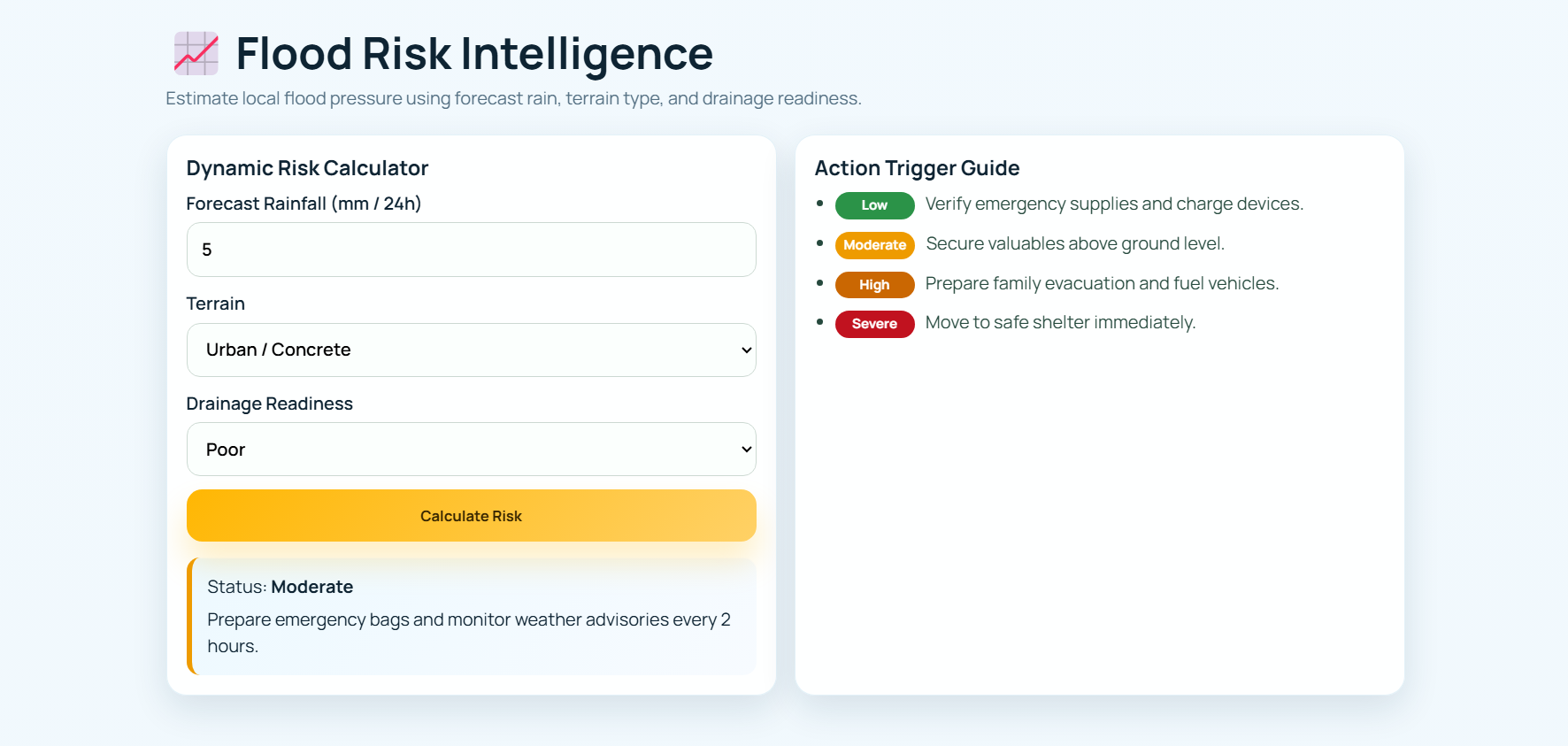 Flood Safety is a real-time web app that monitors flood risk, sends early alerts, and provides safety recommendations. It helps users understand danger levels in their area and guides them on what actions to take before and during a flood.