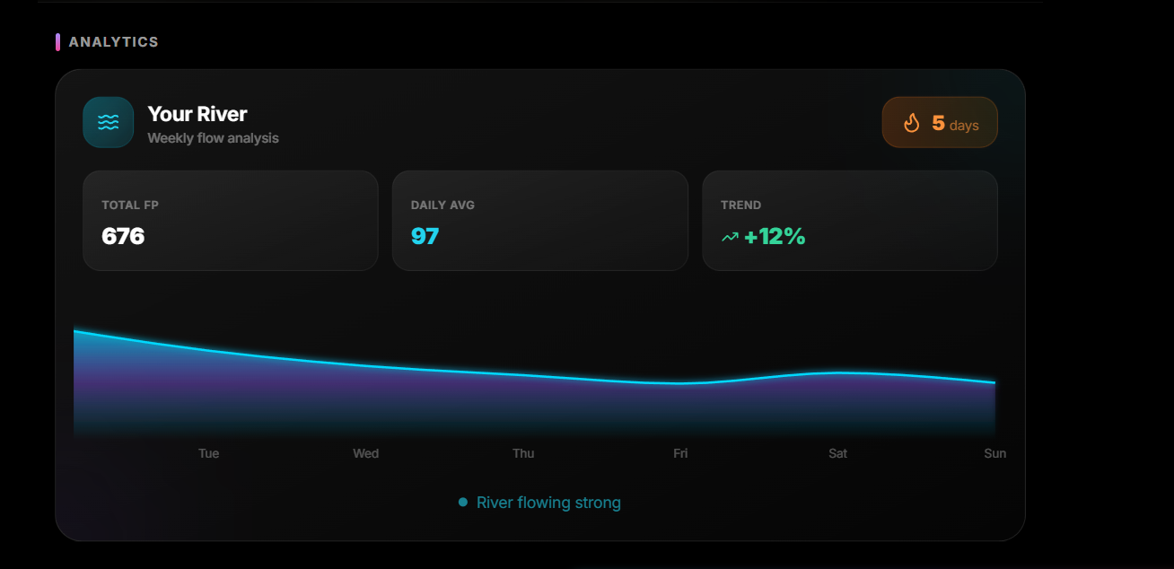 Challenges we ran into unique IDs and Liquid Graphs The biggest technical hurdle was visualizing the data. Creating a "River Graph" that flows smoothly instead of a standard jagged bar chart required hacking standard charting libraries to render organic, curved areas that react to user streaks. Another significant challenge was the referral architecture. I needed a system where every user, upon signing up, was automatically assigned a unique, collision-free 6-character Invite ID (e.g., "FLOW99") to allow for "Flow Squads." Writing the database triggers in Supabase to handle this auto-generation without errors during high-traffic sign-ups was a complex logic puzzle, but solving it allowed for the seamless social growth mechanics that define the app.