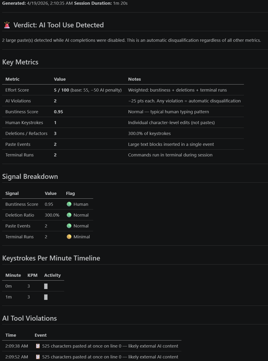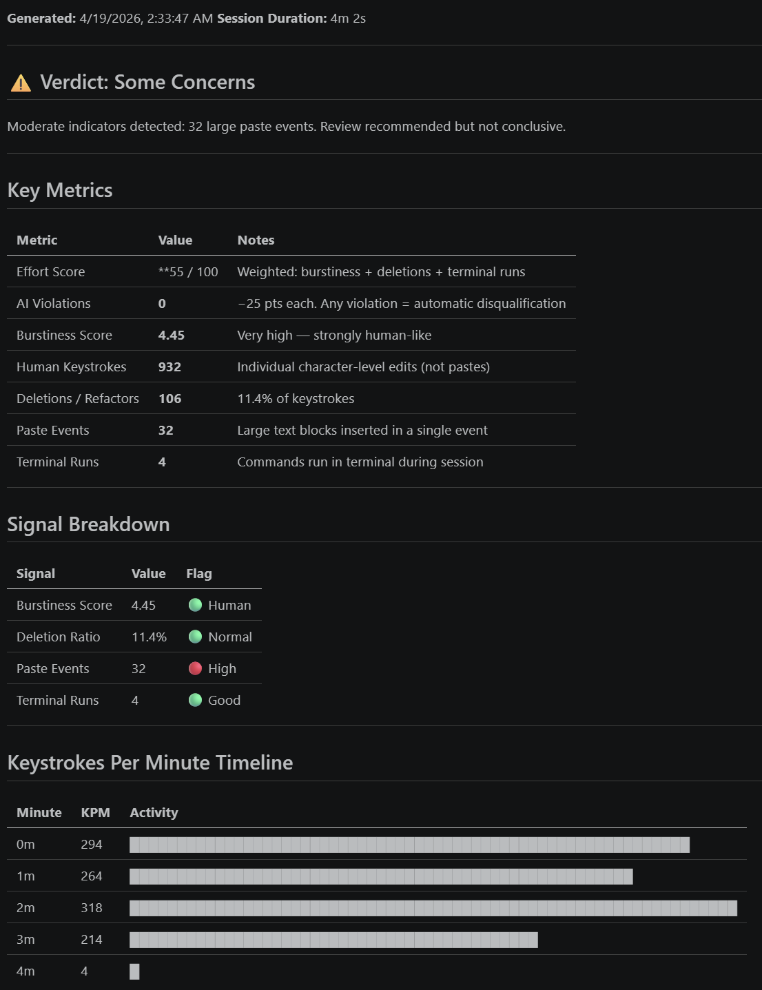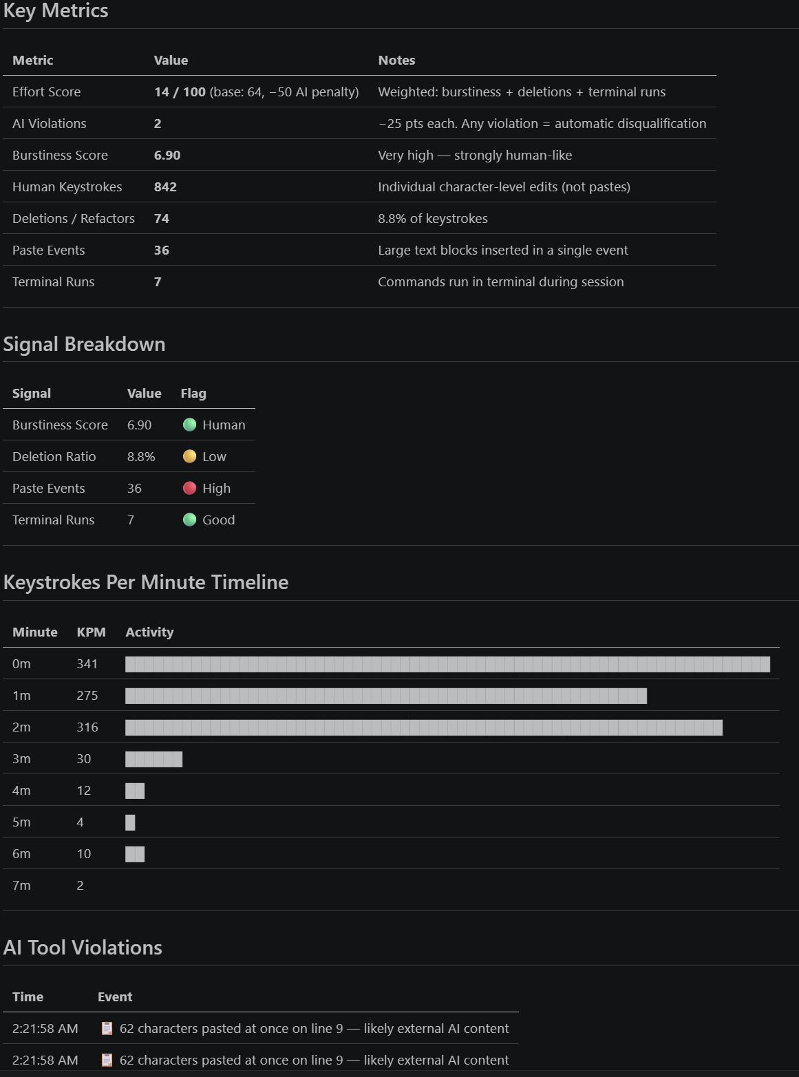 - Balancing strictness vs false positives when labeling suspicious patterns (paste size, burstiness thresholds, deletion ratios).