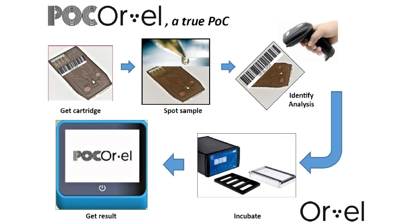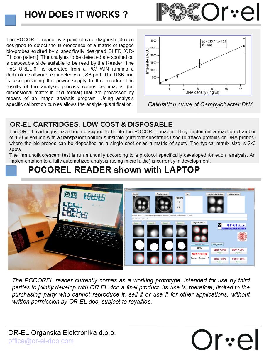 The developed diagnostic tool is based on immuno-fluorescence detection, excited by a custom designed Organic LED (OLED); it detects the presence of antibodies or antigens (like virus or bacteria) in a liquid matrix (like serum, saliva, urine, etc.). The system is composed of three devices, the first one being a disposable cartridge. The bio-probes (antigens or oligonucleotides probes) are deposited on a plastic substrate, while a simple fluidic circuit allows the reagents (extremely low amount/low cost) to interact with the biologic fluid under analysis. The cartridges are incubated for few minutes in a simple portable incubator. Finally, the cartridges are red out in few seconds using a portable reader device. A laptop PC is used to control the devices, to store the results and to made them available in the Cloud.