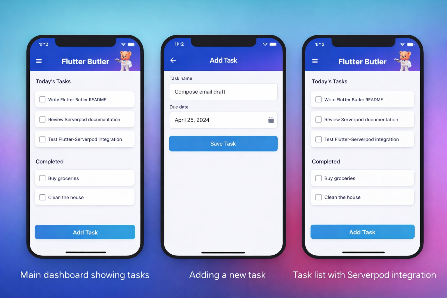 Flutter Butler helps users manage everyday tasks in a simple and efficient way. The main goal of the project is to demonstrate clean communication between a Flutter frontend and a Serverpod backend.