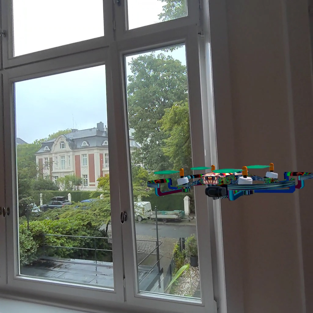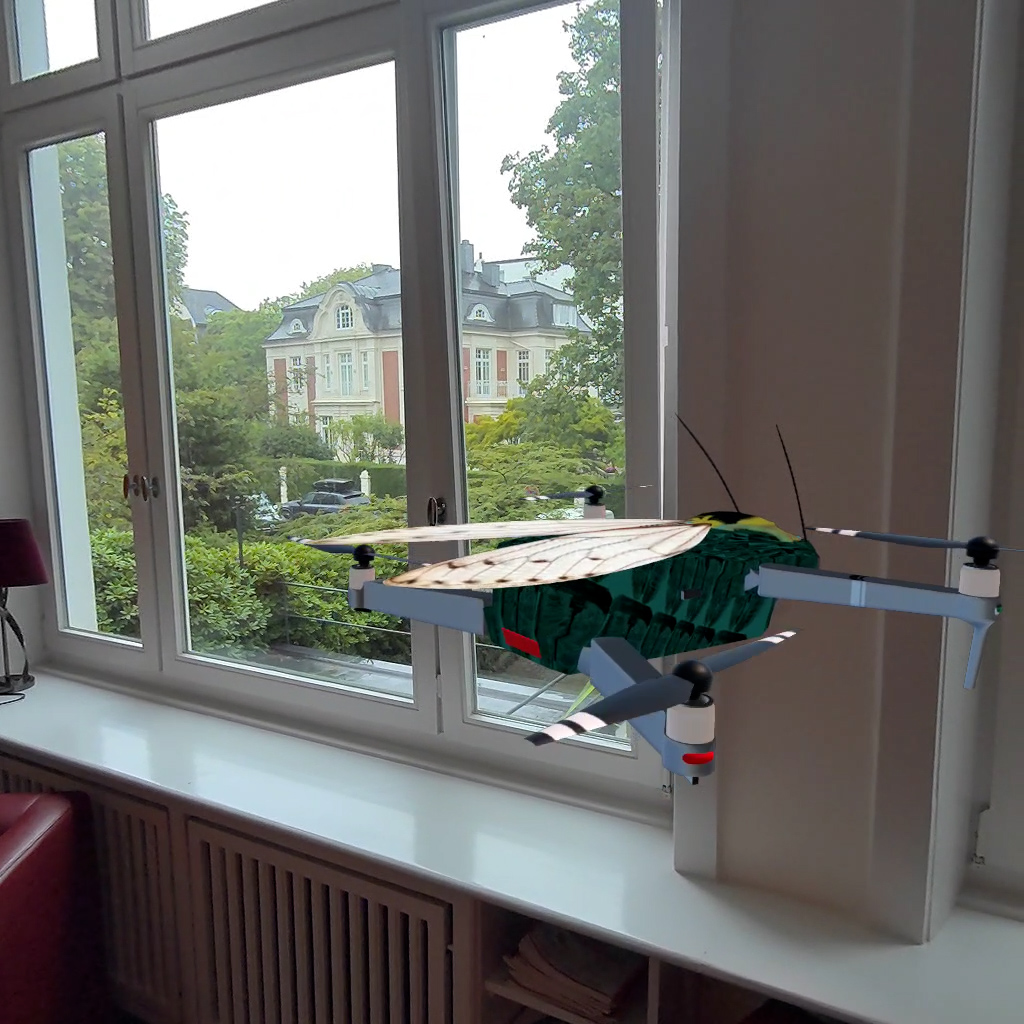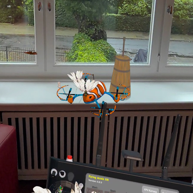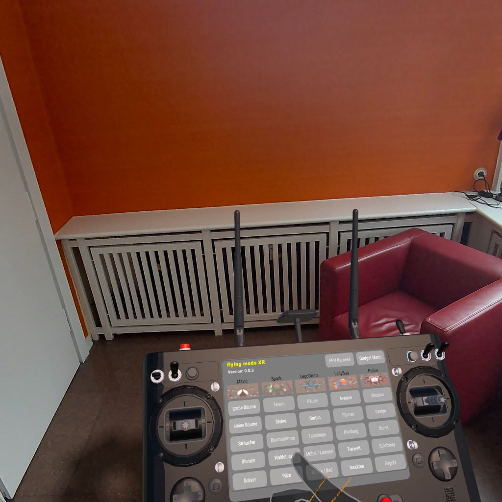 Not a game, but a Mixed Reality Experience: In "flying mods XR" for the Quest 3, you control — in a Simulation — one of six fantasy drones with individual camouflage, FPV camera, sound, and spotlight, to freely place a variety of miniature gadgets in your living space — Experience. "flying mods" (link are post-technological meditations of multi copters, visual extraordinary exciting objects, which act out the artistic fascinating ideas of the many possible interpretations of the design of the drone in VR. The gadgets range from a wide variety of 3D-realistic trees, grasses, and flowers to rock formations, houses, and vehicles, all the way to insects flying freely in the space.