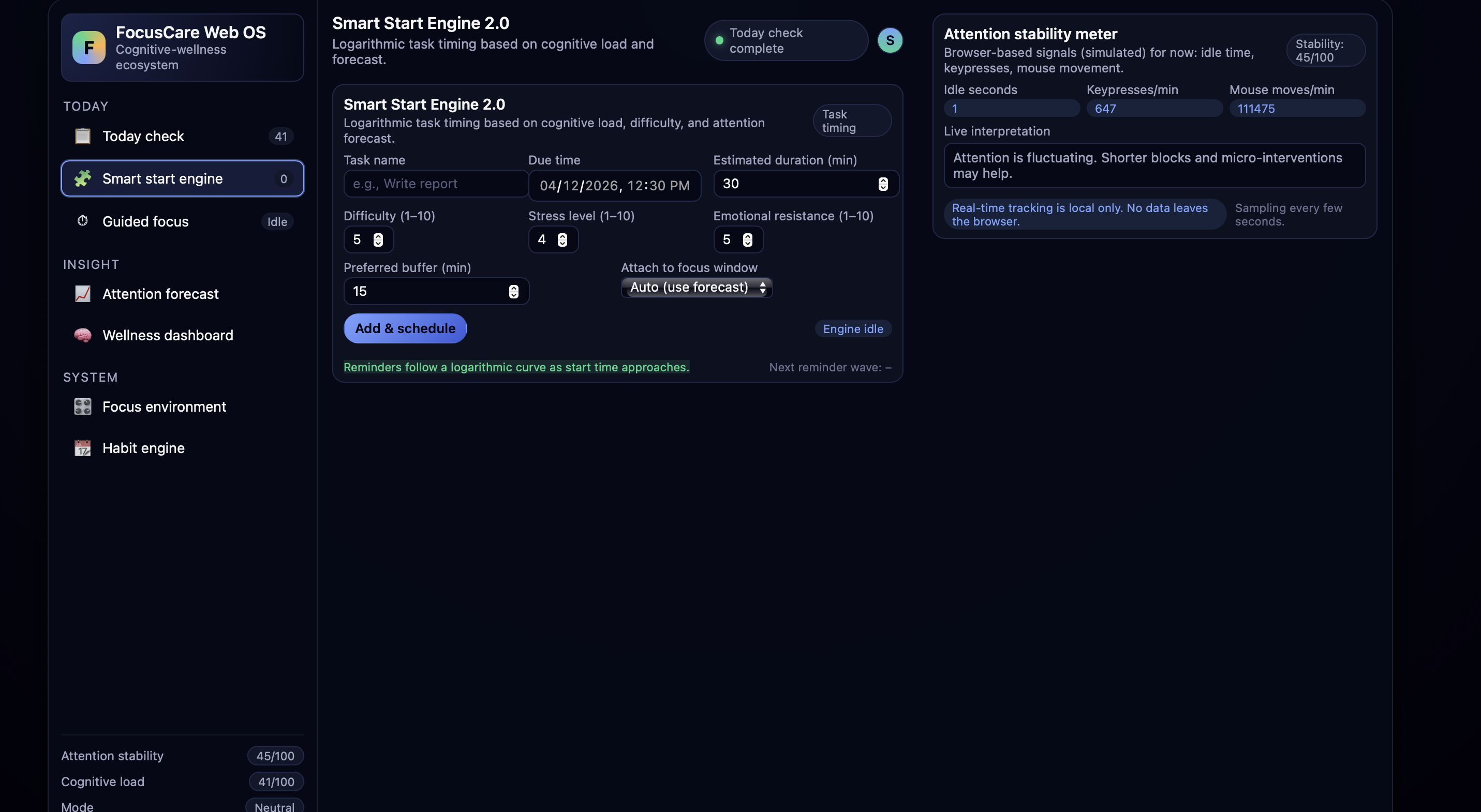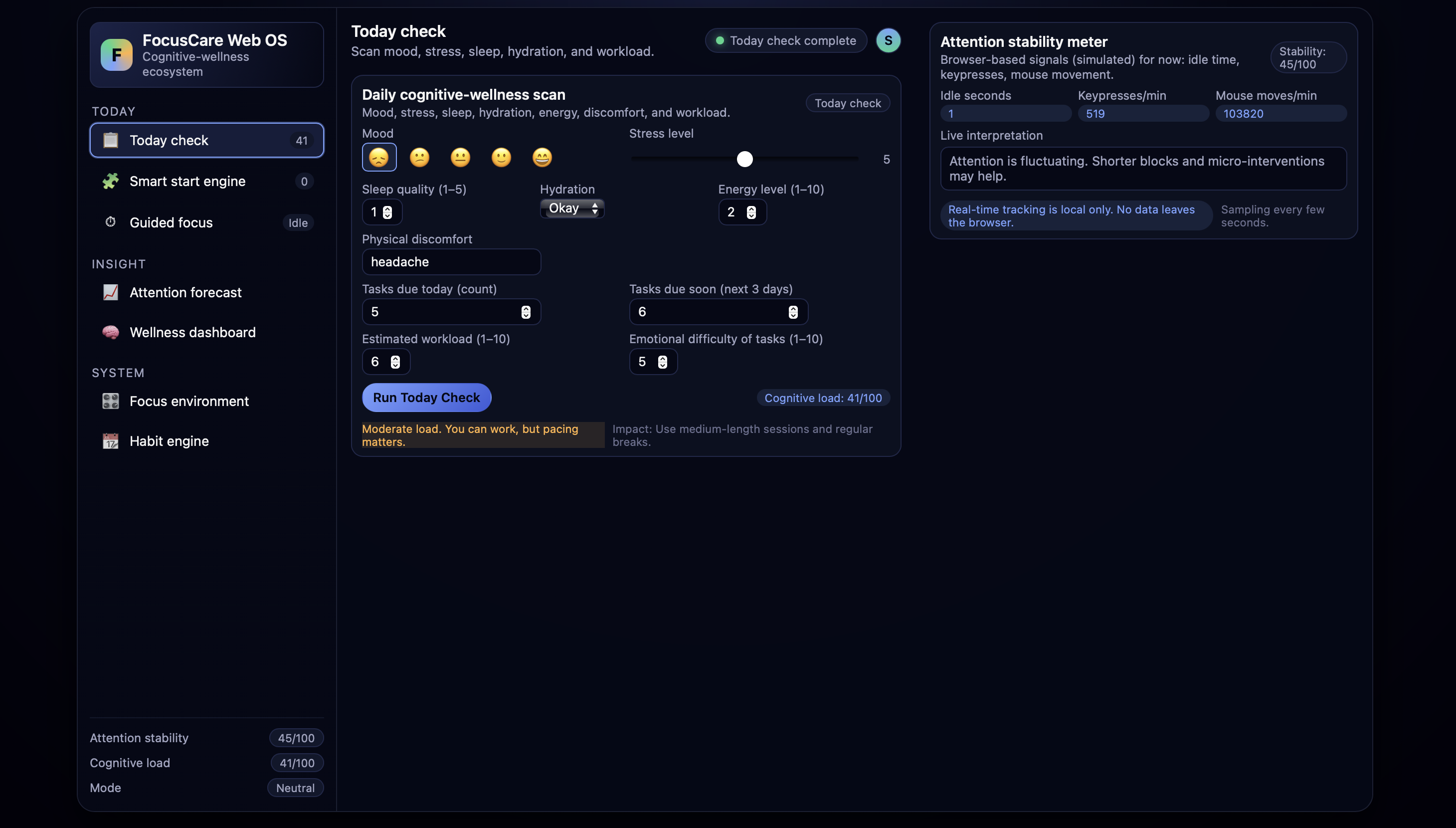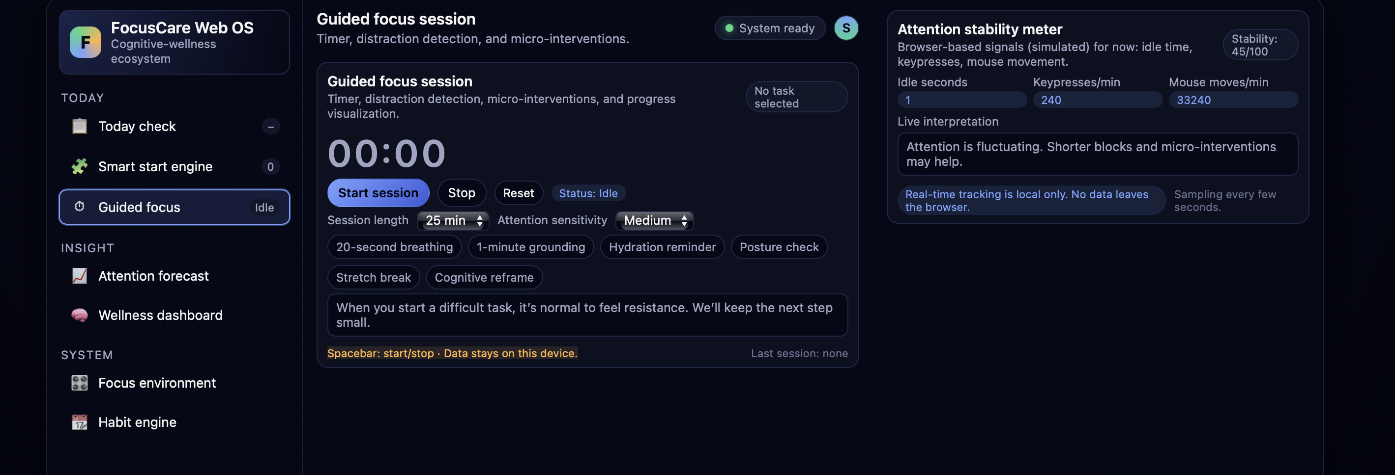 Inspiration FocusCare grew out of the realization that attention isn’t just about productivity—it’s about mental health. Many people struggle with stress, overwhelm, and task‑avoidance, but most tools only track time or create lists. We wanted something that understands how mood, sleep, stress, and emotions shape the ability to focus. That idea became the foundation for a full cognitive‑wellness operating system. What it does FocusCare helps users understand their mind and build healthier attention habits. It performs a daily wellness scan, predicts focus windows, schedules tasks intelligently, tracks real‑time attention signals, and offers supportive micro‑interventions when stress or distraction rises. It adapts the environment, guides focus sessions, and provides insights that connect wellness to attention. How we built it We built FocusCare as a browser‑based web app using HTML, CSS, and JavaScript. The system is organized into modules: a daily cognitive‑wellness scan, a Smart Start Engine for task timing, an attention‑tracking layer, guided focus sessions, adaptive environment controls, and a long‑term habit engine. Each module communicates with the others to create a unified, OS‑like experience. Challenges we ran into One challenge was turning complex psychological ideas—like cognitive load, emotional resistance, and attention drift—into simple, friendly interactions. Another challenge was designing an interface that feels intelligent without overwhelming the user. Building real‑time attention tracking in the browser and coordinating all the moving parts of the OS also required careful planning. Accomplishments that we're proud of We’re proud that FocusCare feels supportive instead of stressful. The daily scan, adaptive environment, and micro‑interventions work together in a way that feels personal and emotionally aware. We’re also proud of the Smart Start Engine, which schedules tasks based on cognitive load and attention patterns. Most of all, we’re proud that the system treats attention as a health metric, not a moral judgment. What we learned We learned how closely attention is connected to wellness—sleep, stress, hydration, and emotions all play a role. We also learned how to design a large, multi‑panel interface that feels like a mini operating system. Building FocusCare taught us how to combine behavioral science with interactive design in a way that feels human and helpful. What's next for FocusCare Next, we plan to add more advanced attention‑forecasting models, deeper emotional‑pattern insights, and personalized intervention recommendations. We want to expand the habit engine, improve the adaptive environment, and eventually build a mobile version. The long‑term goal is to turn FocusCare into a full cognitive‑wellness platform that helps people build healthier attention habits over time.