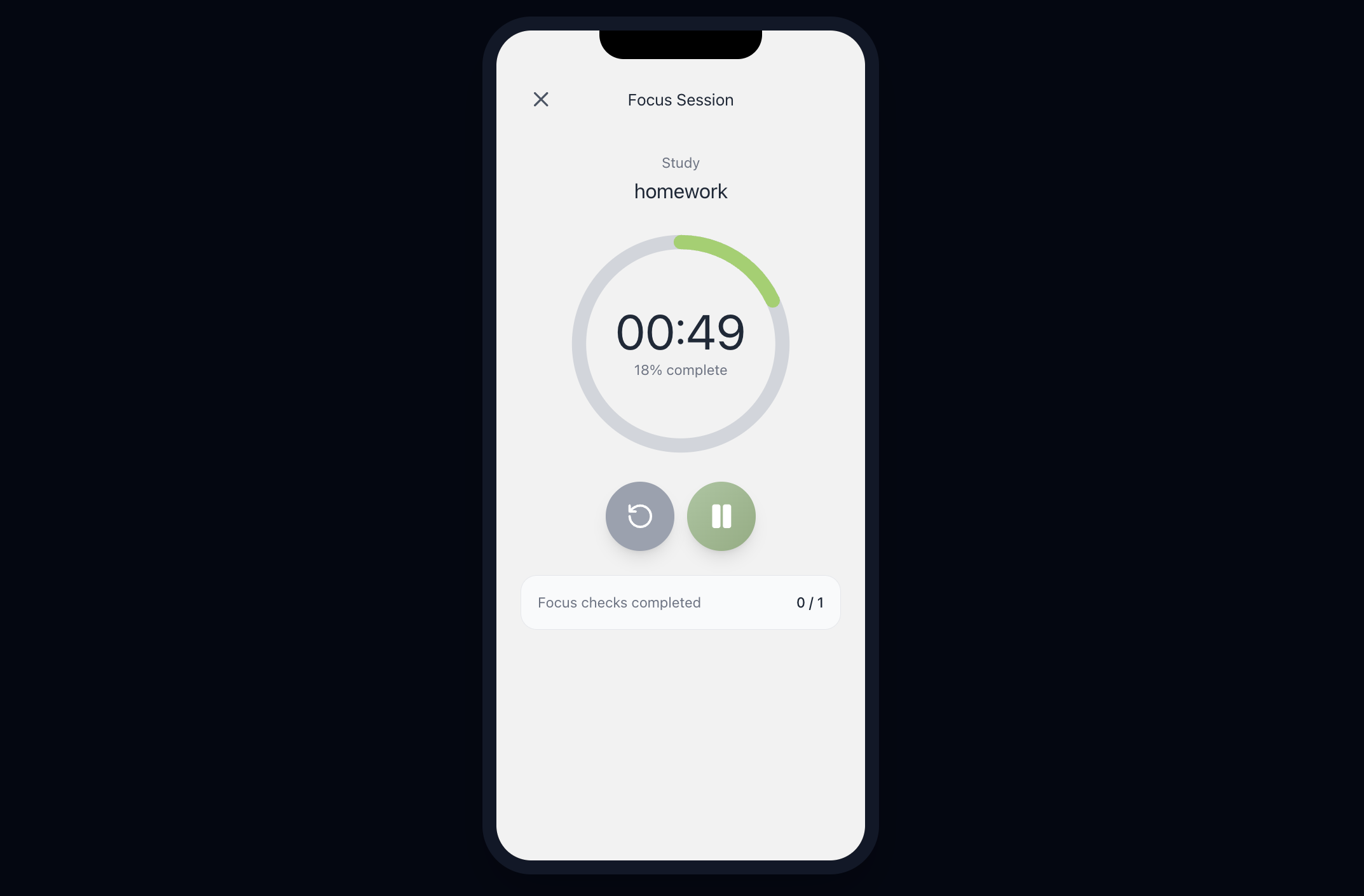 Timer stage in the Focus session page. Engage in distraction-free sessions with our intuitive focus timer and haptic feedback.