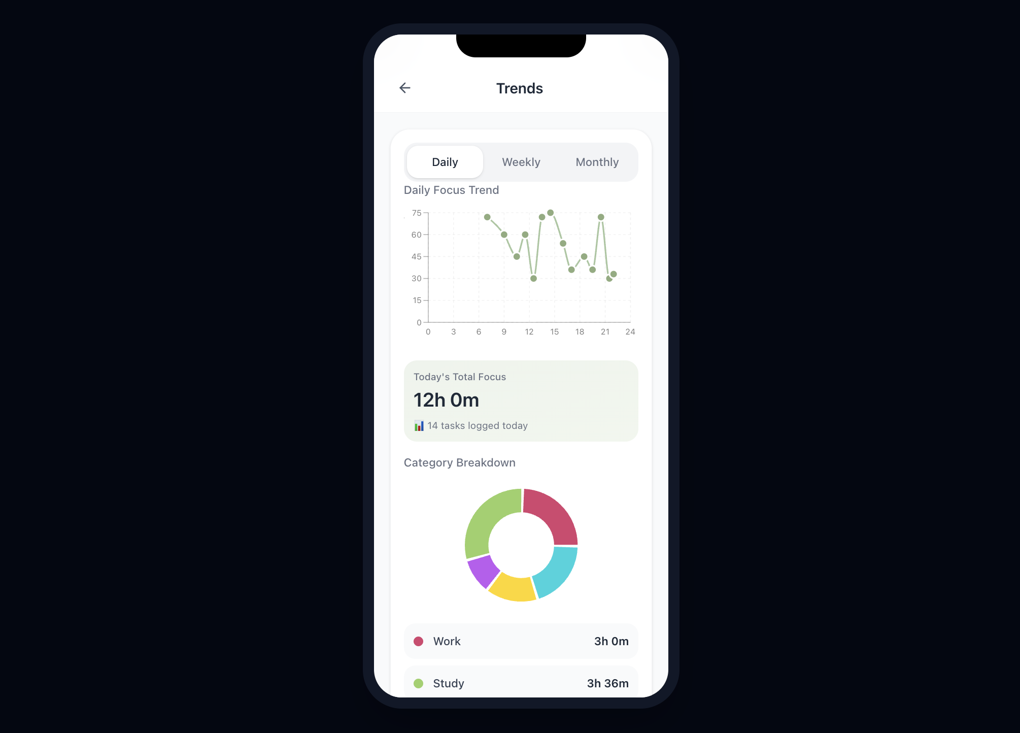 Trends Page. Discover user's productivity patterns with switch of daily/weekly/monthly trend charts and category-based time tracking.