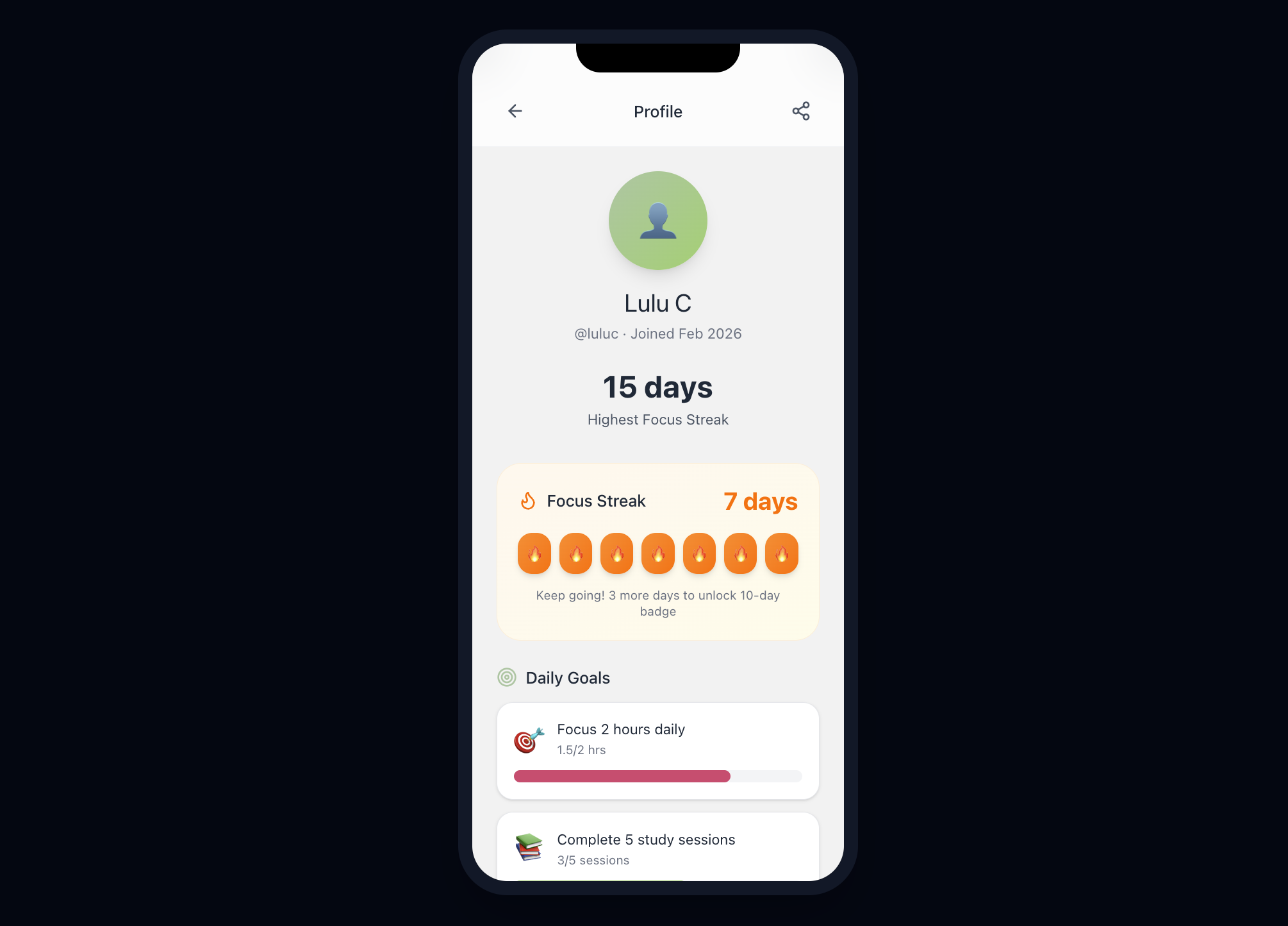 User Profile page. Gamified productivity. Make users stay motivated by tracking their focus streaks and unlocking consistency badges.