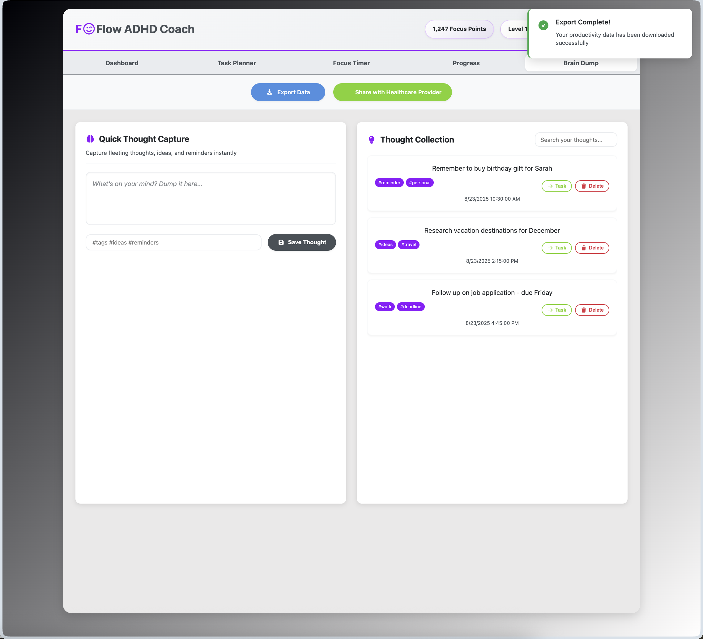- Brain Dump Capture: Instant thought capture with tagging and organization to reduce cognitive overload.