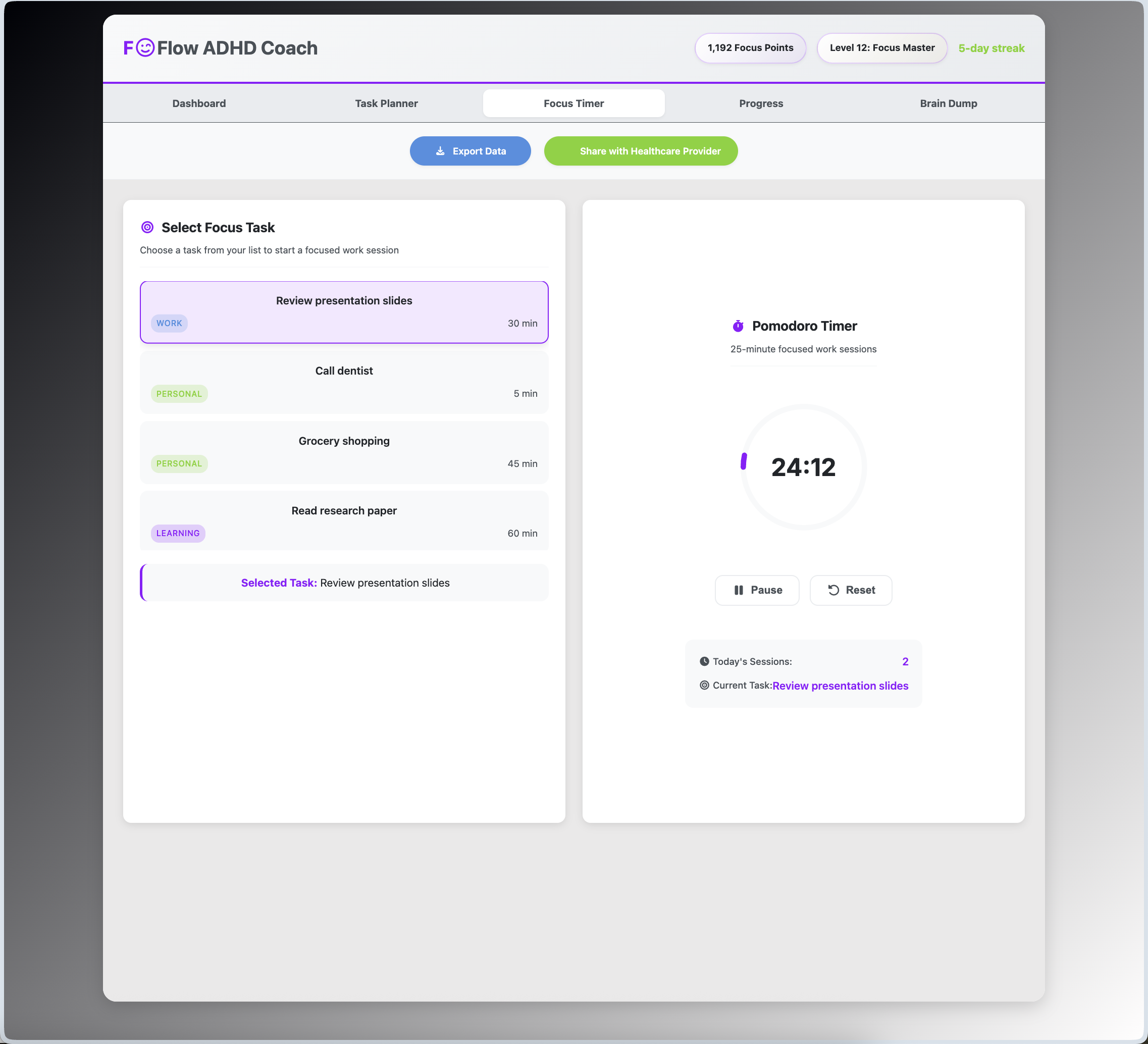 - ADHD-Optimized Pomodoro Timer: Supports focused work sessions with visual countdown, built-in encouragement and break suggestions.