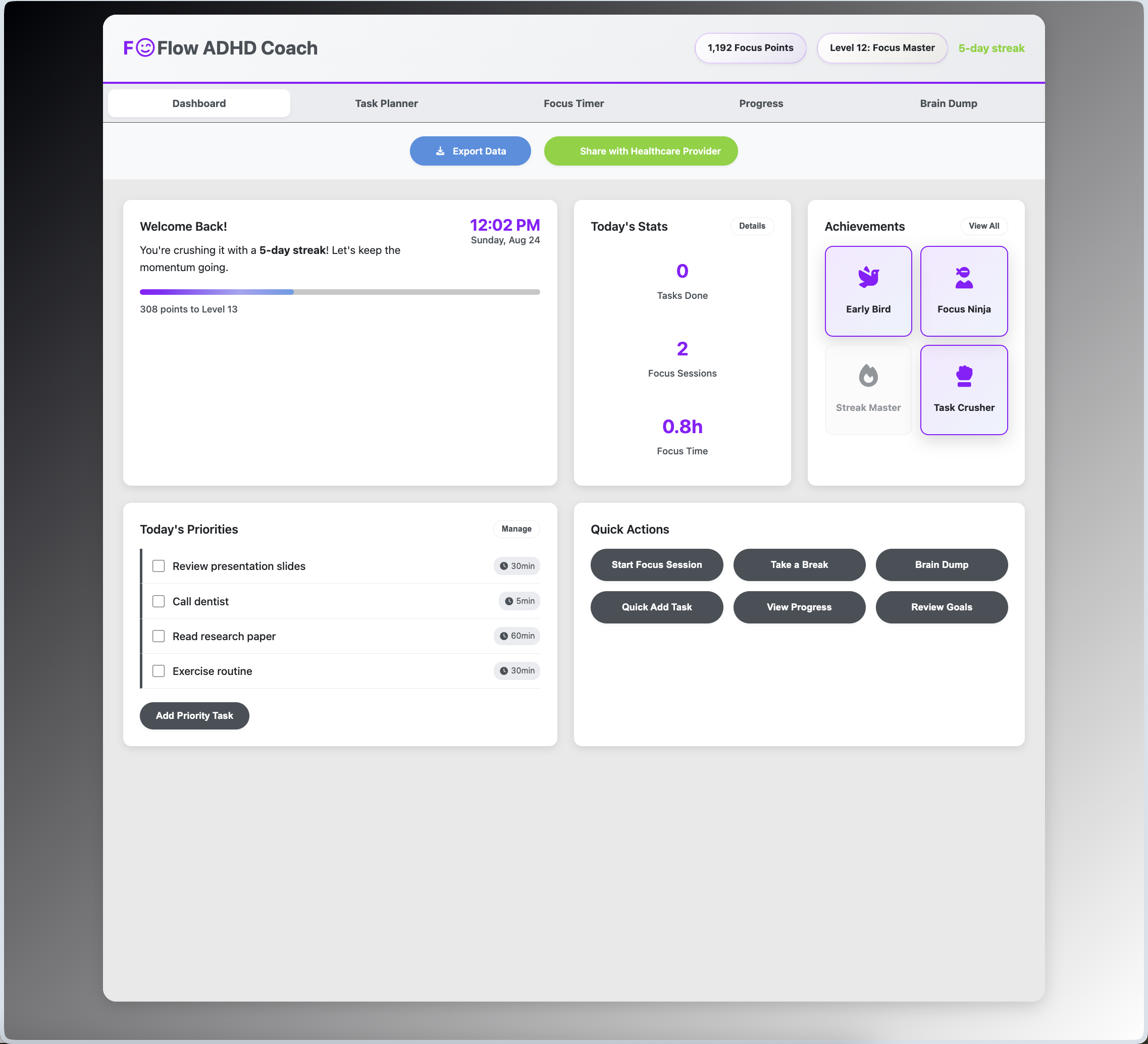 - Motivational Rewards: Gamification elements with dopamine-friendly rewards with badges, points, and streaks to promote productivity.