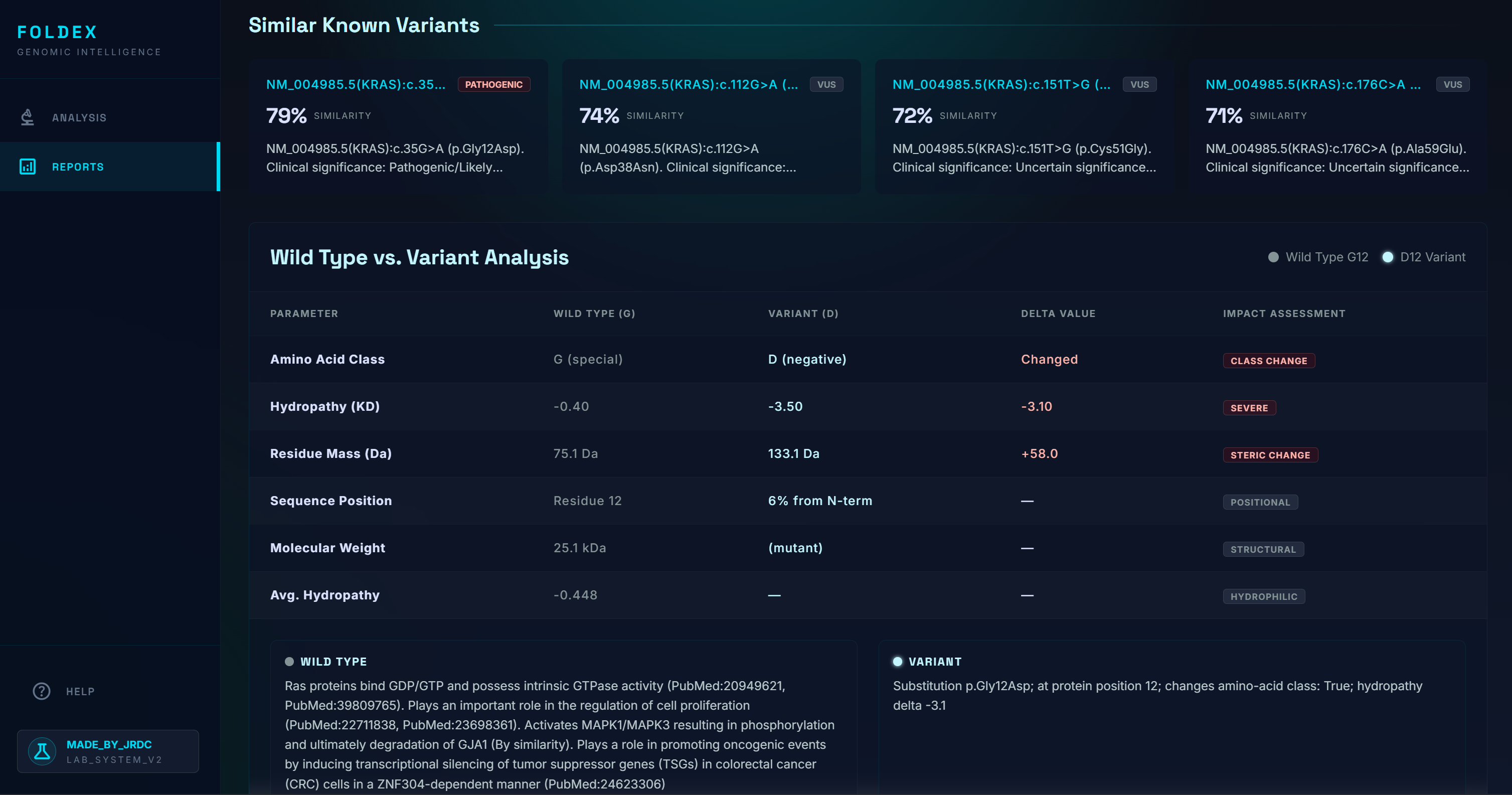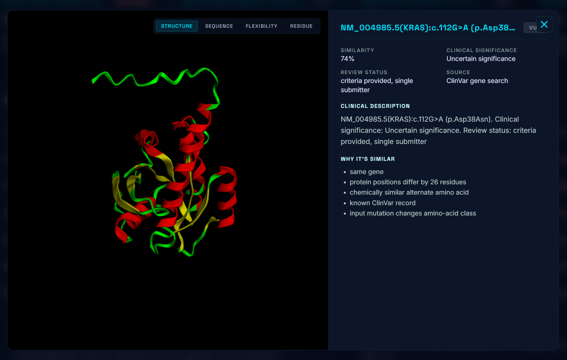 - The five to ten most biologically similar mutations that have been studied, ranked by domain, residue distance, amino-acid property change, and pathogenicity-score similarity. We specifically scan through the most up to date research on bioRxiv, NCBI, etc for these known variants.