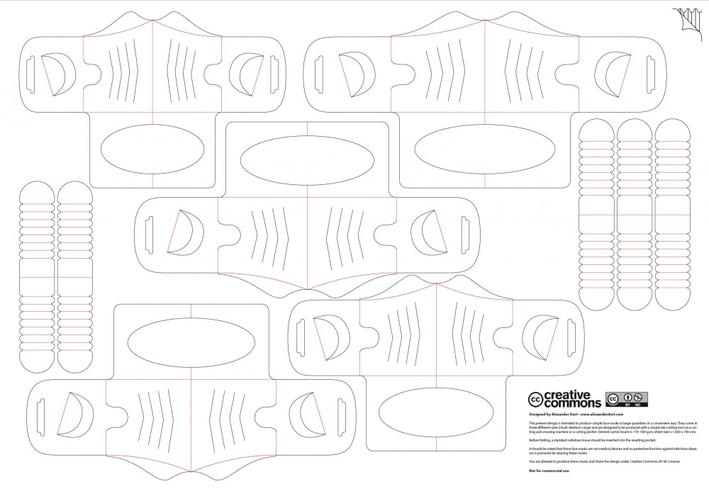 The demand for face masks is currently enormous due to the worldwide COVID-19 pandemic. However, the availability of such masks is limited. As a result, masks are now often produced manually by workshops, tailors and volunteer workers. However, the production capacities and speeds for this are very limited. On the other hand, many industrial production systems in the packaging industry are currently at halt due to the pandemic. This gave me the idea to use the enormous production capacities of the worldwide printing and packaging industry to produce simple face masks in large quantities. I designed this in such a way that theoretically every printing company and every converter that has a simple die-cutter in 3B format or also owners of cutting plotters can produce such masks from folding carton or film. In the simplest case, printing is not even necessary, but it could also be used to embellish the masks or for advertising purposes.