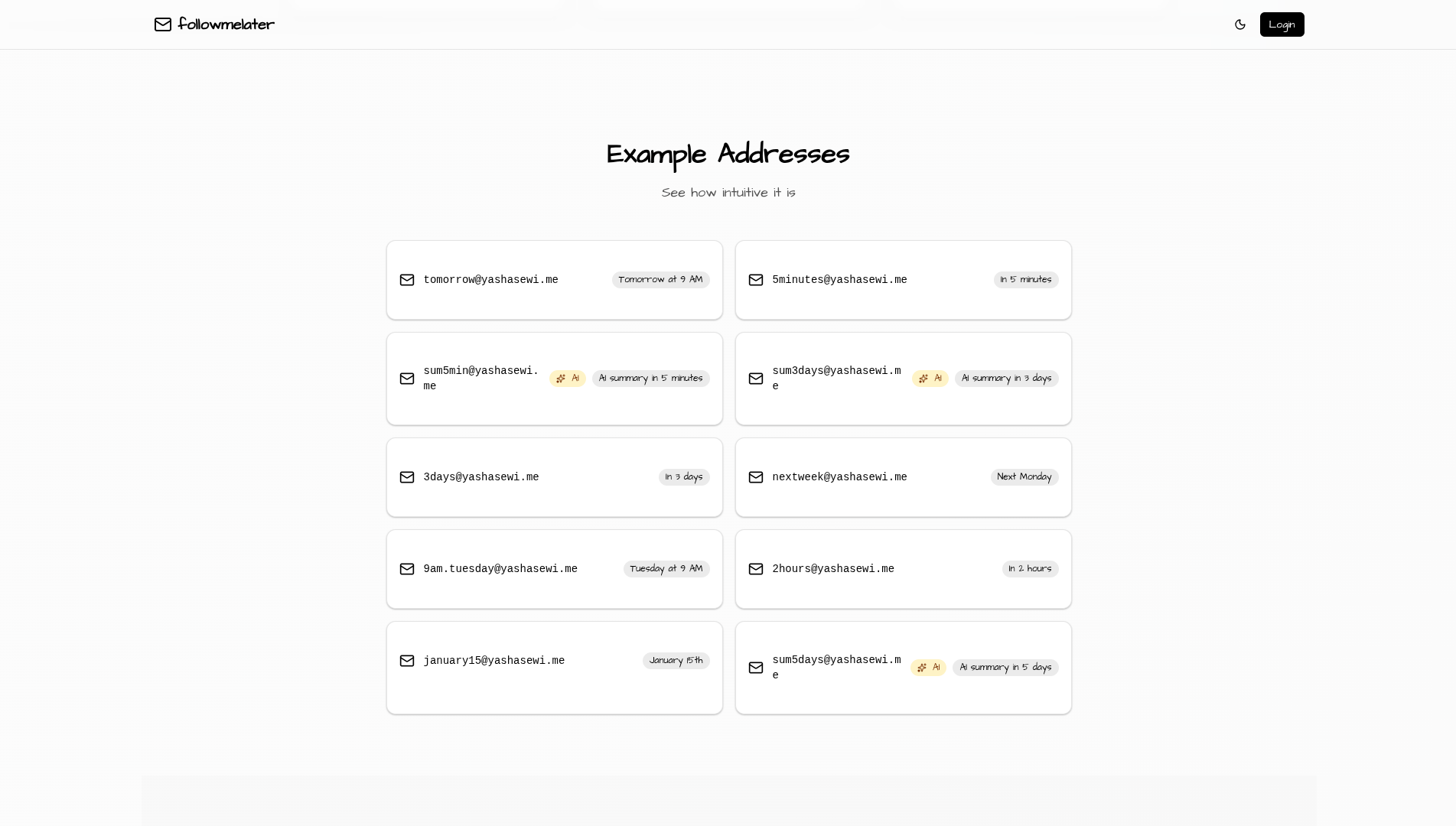 followmelater was born from this simple idea: use the tool you already use every day - email - to schedule reminders. No apps, no accounts, no friction. Just send an email to tomorrow@yashasewi.me and it comes back to you tomorrow.