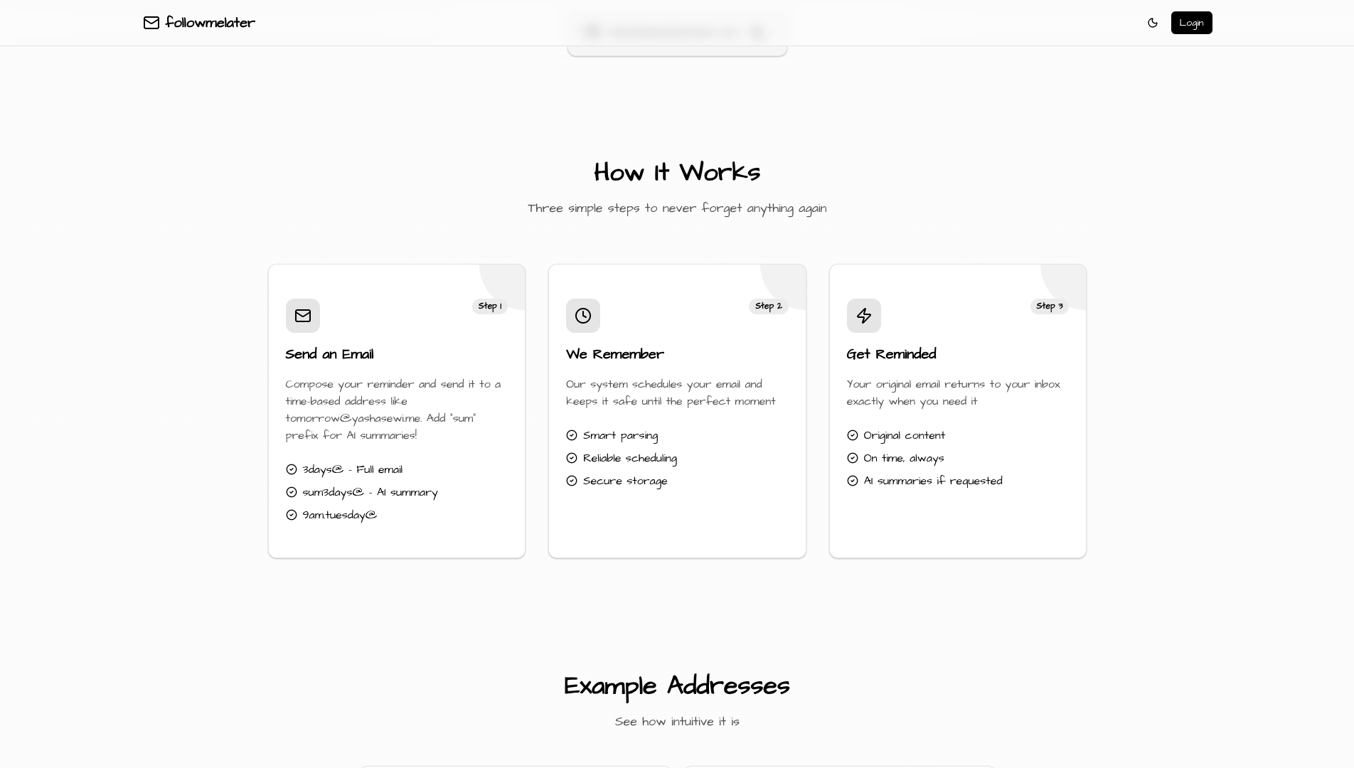 followmelater is an email-based reminder service that lets users schedule follow-ups by simply sending emails to time-based addresses. The magic happens through: