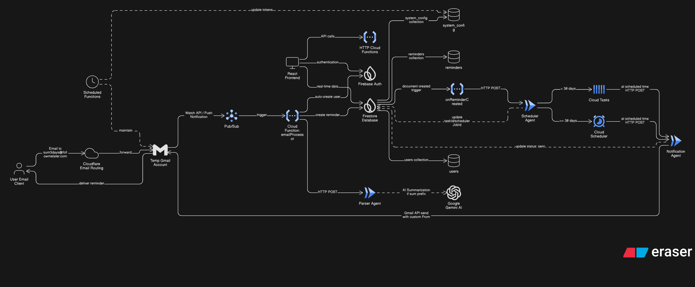 Parser Agent (Cloud Run) → Extracts time ("3days") + Gemini AI summarizes email