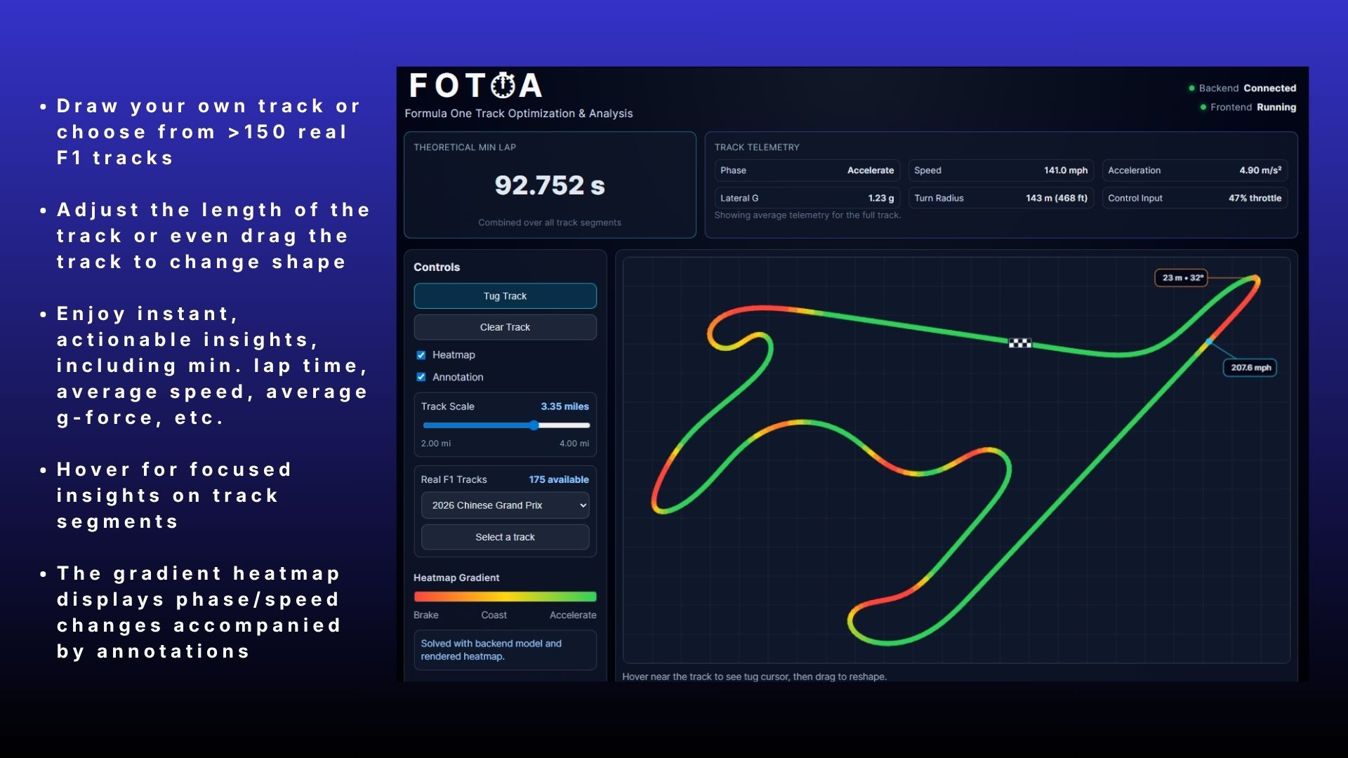 FOTOA is an interactive F1 lap-time simulator. You can draw a custom circuit or select a real F1 track from FastF1 telemetry, then compute a theoretical minimum lap time with segment-level telemetry data, actionable insights, and heatmap overlays.