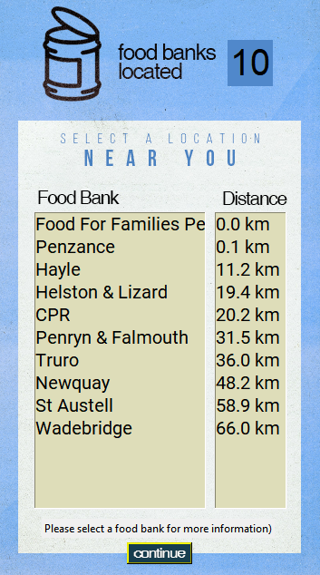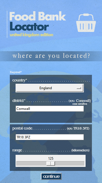 The following program locates nearby food banks within a given district, address, and radius in the United Kingdom. Errors will be given if the required fields are missing. If no postal code is given, then it displays food banks in the inputted district. If a postal code is given, it will return the 10 closest food banks to you. The information that is displayed in the GUI after choosing a food bank is the name, address, email, link to the website, and the foodbanks needed/given food.