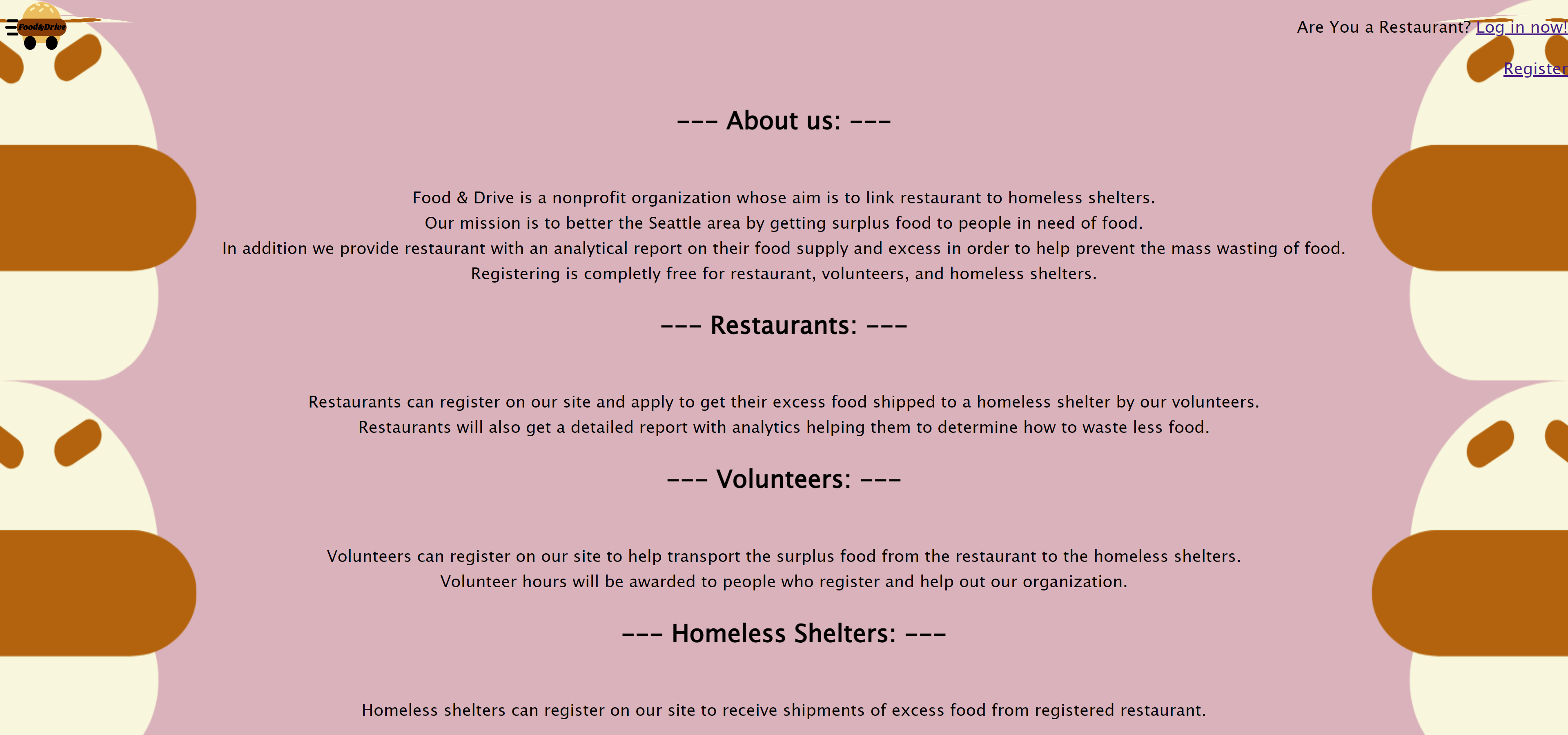 Our app allows restaurants to partner with us to give us excess but good food, volunteers to sign up and drive the food around to homeless shelters, which will use the food to give to homeless people.