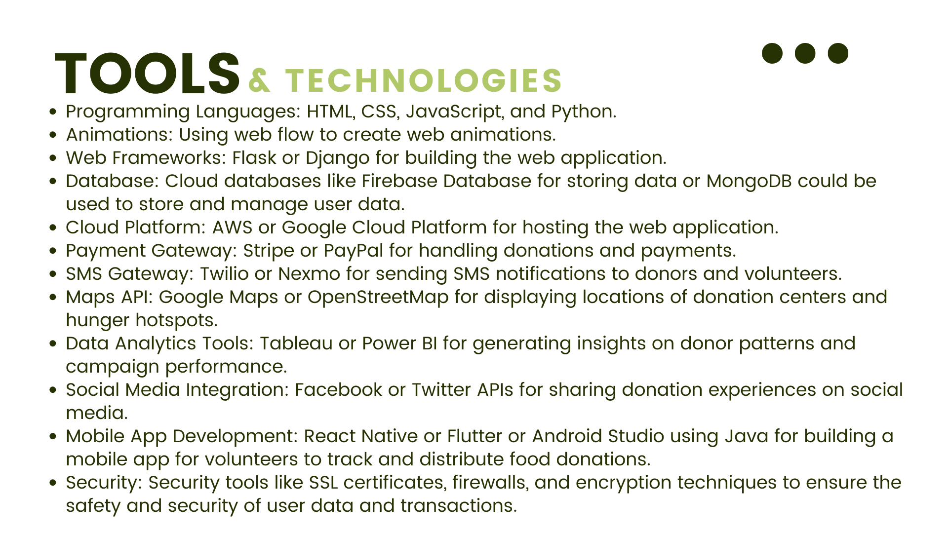 We wish to build Food For All using a combination of front-end and back-end technologies, including React, Node.js, and MongoDB.