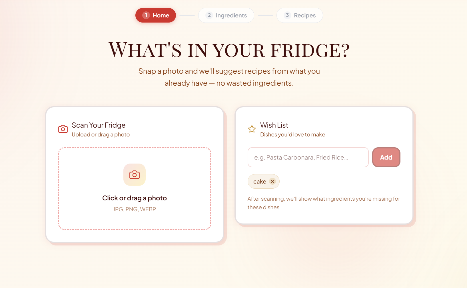 - Smart recipe generation — five recipes with difficulty ratings, prep times, ingredient match counts, and chef's tips, all generated from a single fridge photo