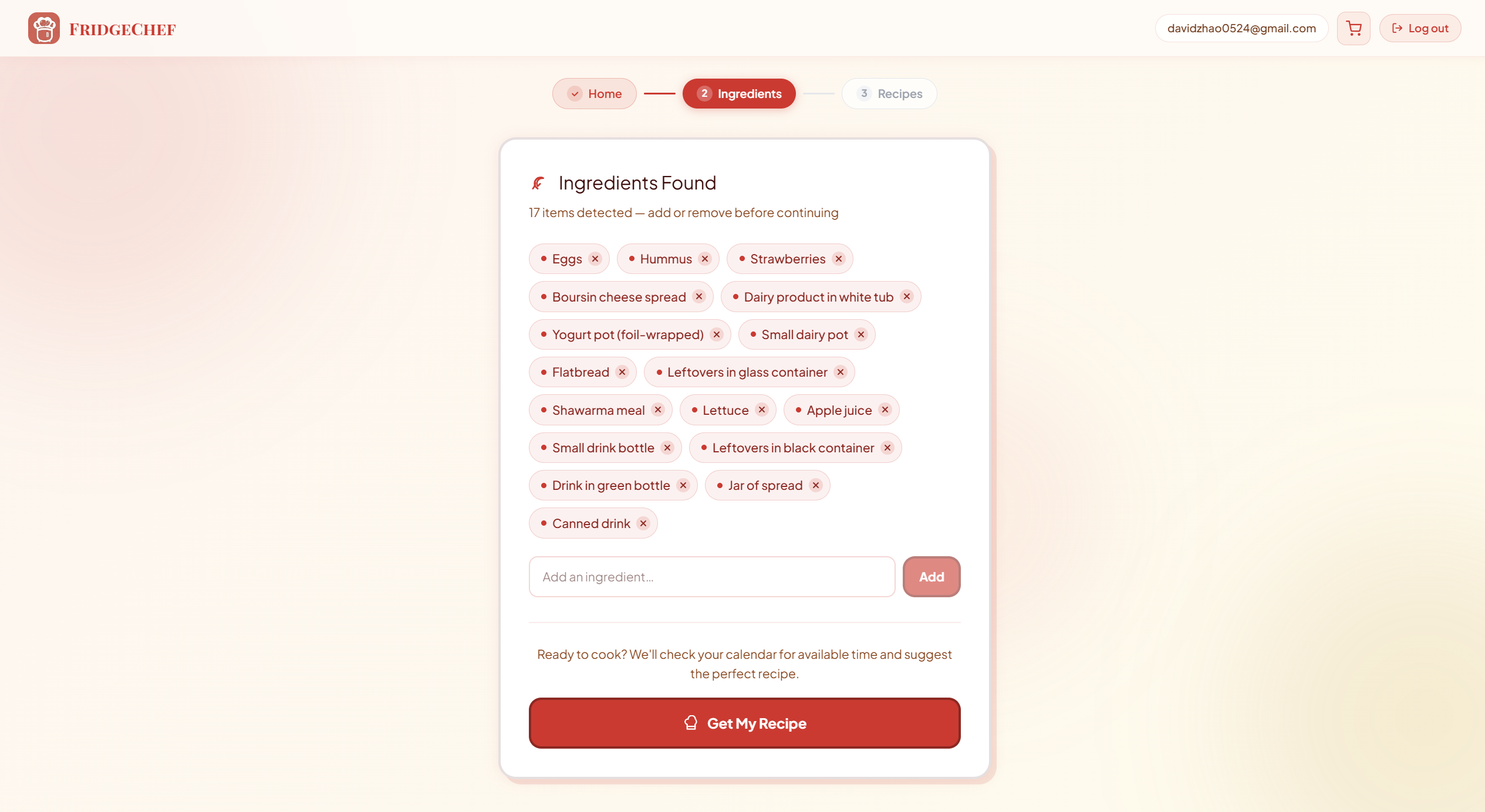 AI layer: We used Gemini 2.5 Flash for both vision (ingredient detection from the fridge photo) and text (recipe generation). The image is converted to base64 on the client, sent to a /api/detect-ingredients function, and the result is a structured JSON list of ingredients. We then feed that into /api/generate-recipe along with how many free minutes the user has tonight, their wish list, and a list of recipes to exclude so the Regenerate button never repeats itself.