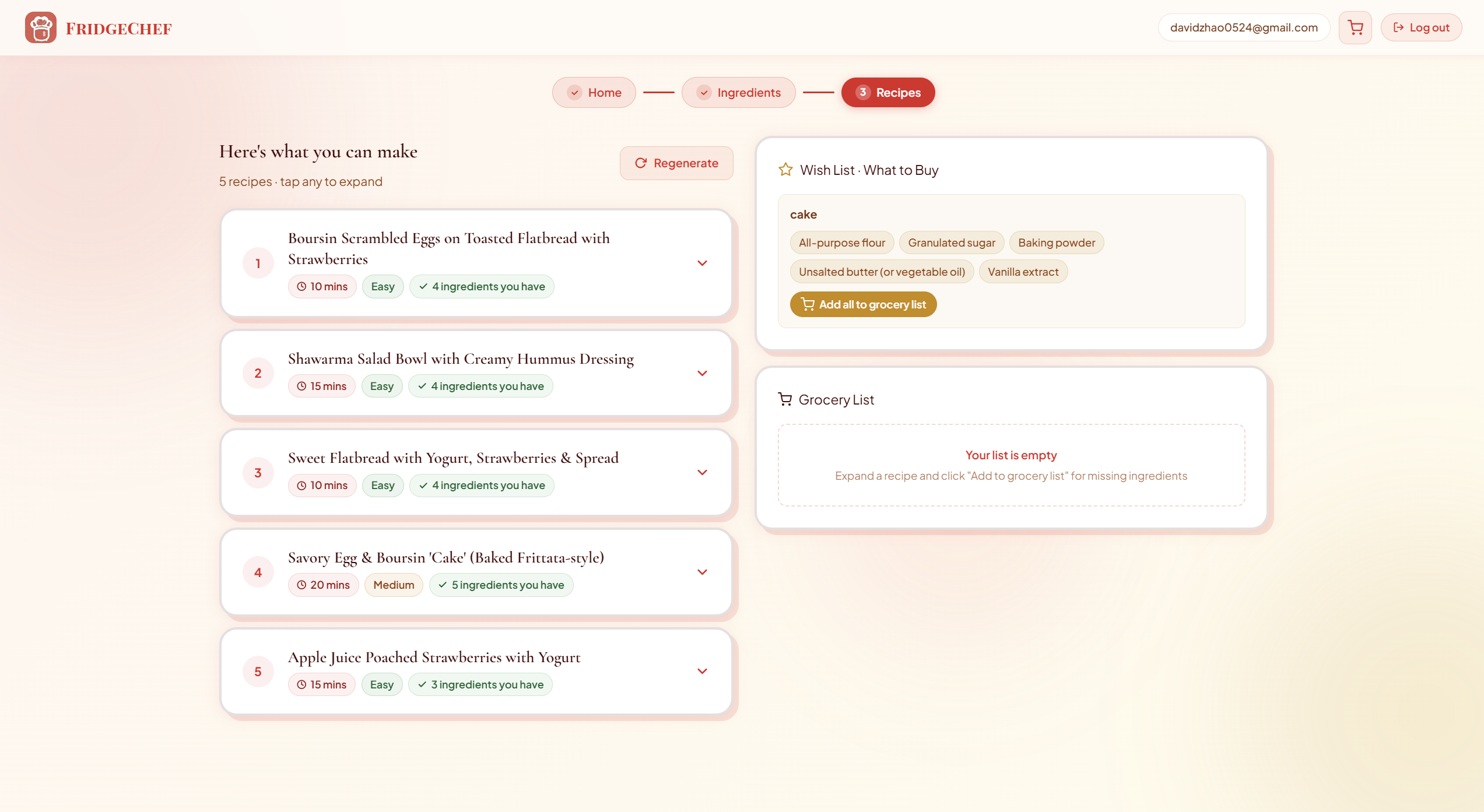 - Suggest — five recipes are generated based on what you have, tailored to your available cooking time (quick meals if you're busy, something more elaborate if you're free)