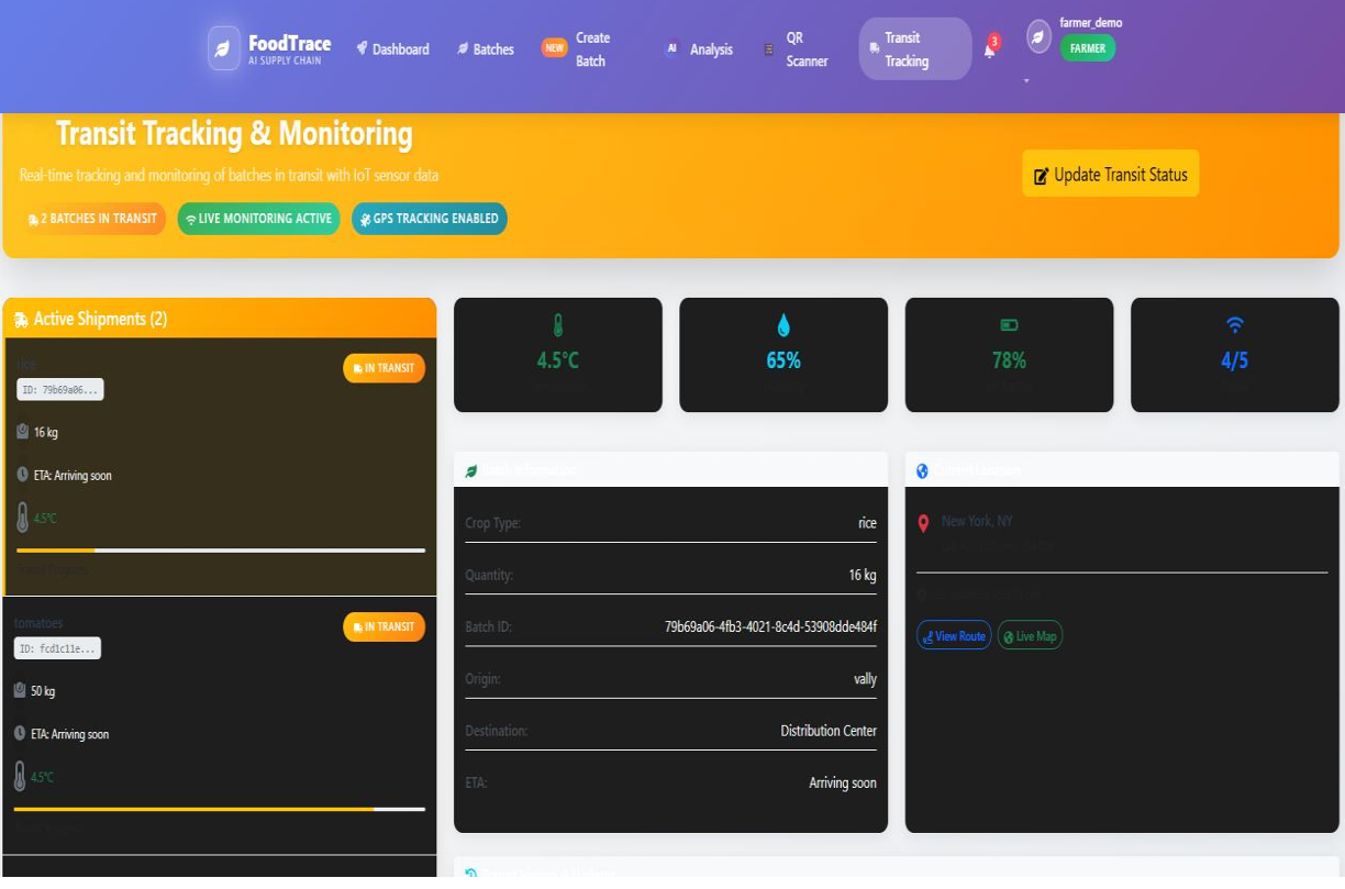 Tracks food products across the entire supply chain Uses AI to detect spoilage and contamination from images Predicts nutritional degradation during transport Stores critical supply chain events on blockchain for transparency Provides role-based dashboards for farmers, distributors, retailers, and consumers Enables QR code scanning for instant product history access Monitors environmental conditions like temperature and humidity