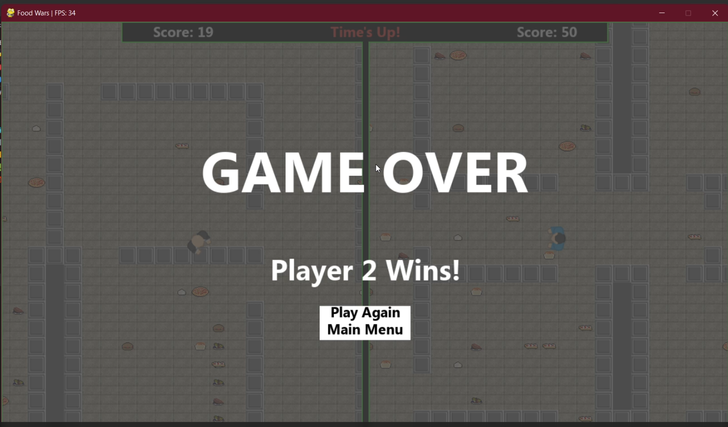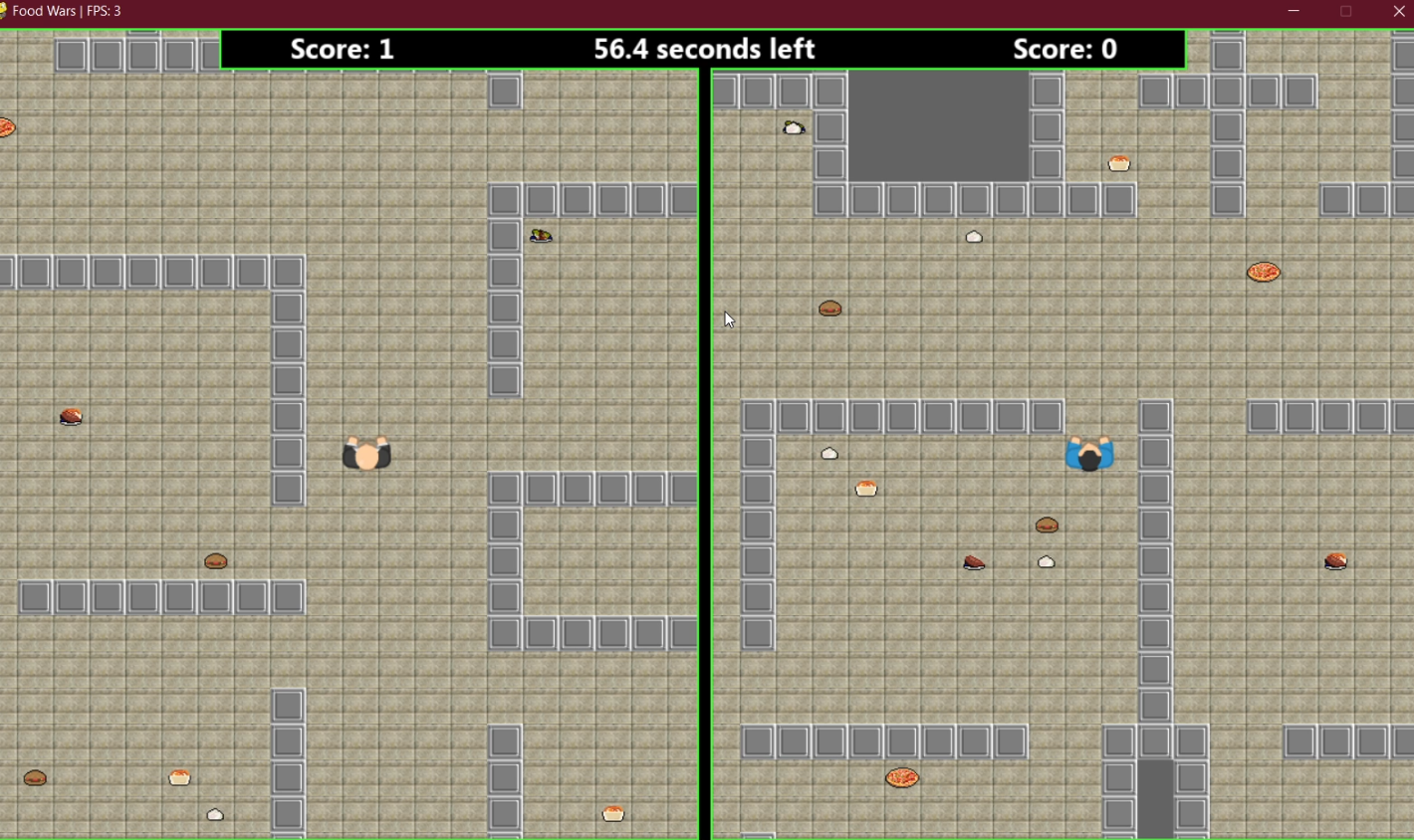 This is a Food game where 2 players have to collect the food items scatters in the maze. They have a time limit of 60 seconds to collect as much food as possible. After the times run over and the score is calculated, and the winners are decided. There are different types of food items with different points.