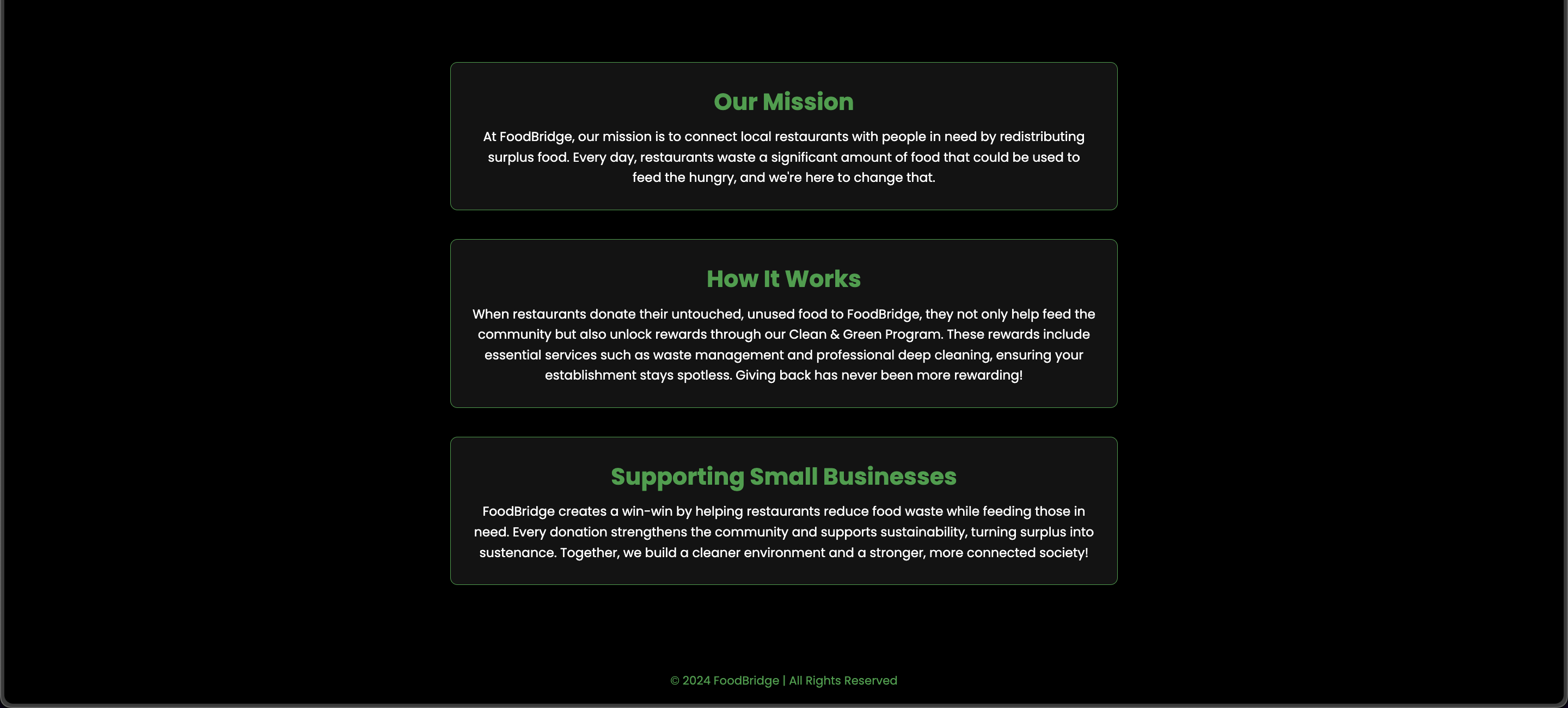 With half of our team working in the food industry, we saw firsthand the staggering amount of food wasted daily. This inspired us to act, creating a solution that not only reduces food waste but also helps those who are uncertain about where their next meal will come from. FoodBridge was born from our drive to make an immediate impact on both restaurants and the community.