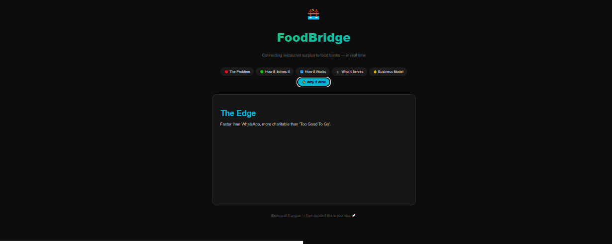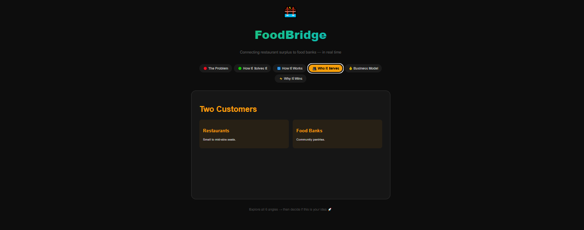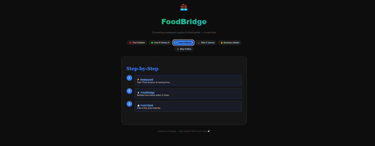 🍕 A restaurant has 20 leftover portions at 9pm. They open FoodBridge and post the surplus in under 60 seconds — quantity, food type, pickup deadline 📡 FoodBridge instantly notifies all food banks within a set radius that have confirmed availability today 🏠 A food bank sees the alert, taps "Claim", and gets the restaurant's address automatically 🚗 A volunteer picks up the food before closing time 📊 Both sides receive an impact summary — meals saved, CO₂ avoided, and a shareable donor badge