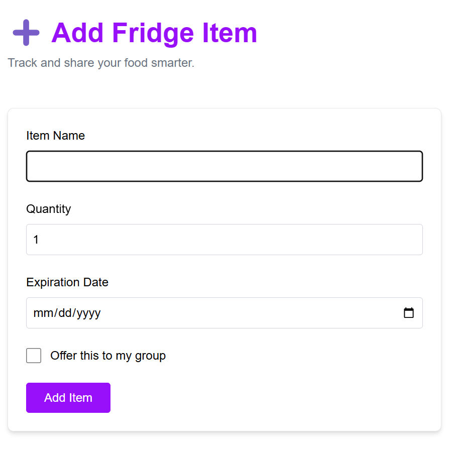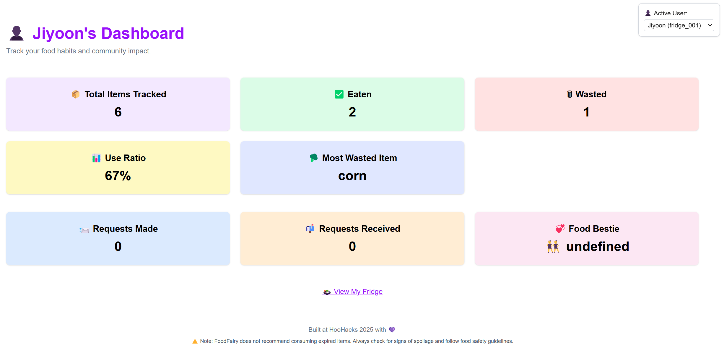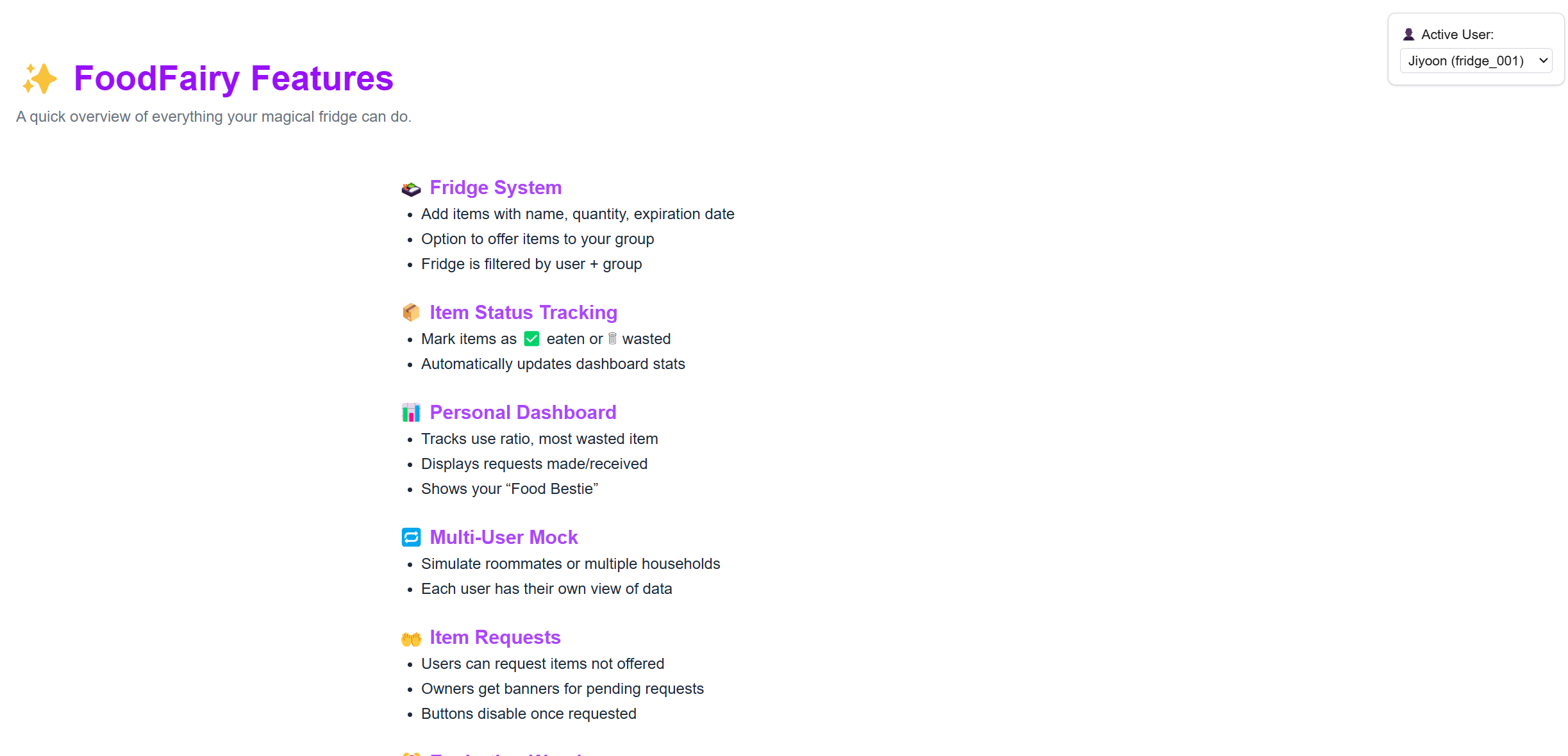 FoodFairy is a magical fridge companion designed to track, share, and reduce food waste in communal living spaces like dorms, shared apartments, or even households.