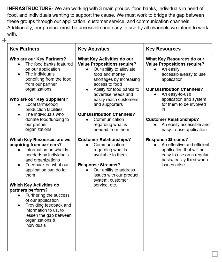 We felt that a web application was the best solution for our project because it is easily accessible by food banks, customers, and supporters alike. Additionally, our team members had more experience with web applications compared to mobile, so developing a web app felt like the best course of action for our project. We quickly realized that, even in a more specific market, there are many different types of individuals involved in the food-centric nonprofit world. Therefore, we had to determine who exactly we wanted our product to work for. Through our research, we found 3 main groups that we believed our product could serve best: food banks, their customers, and their supporters. This report will continue to discuss these 3 groups and how we intend to solve this problem for them.