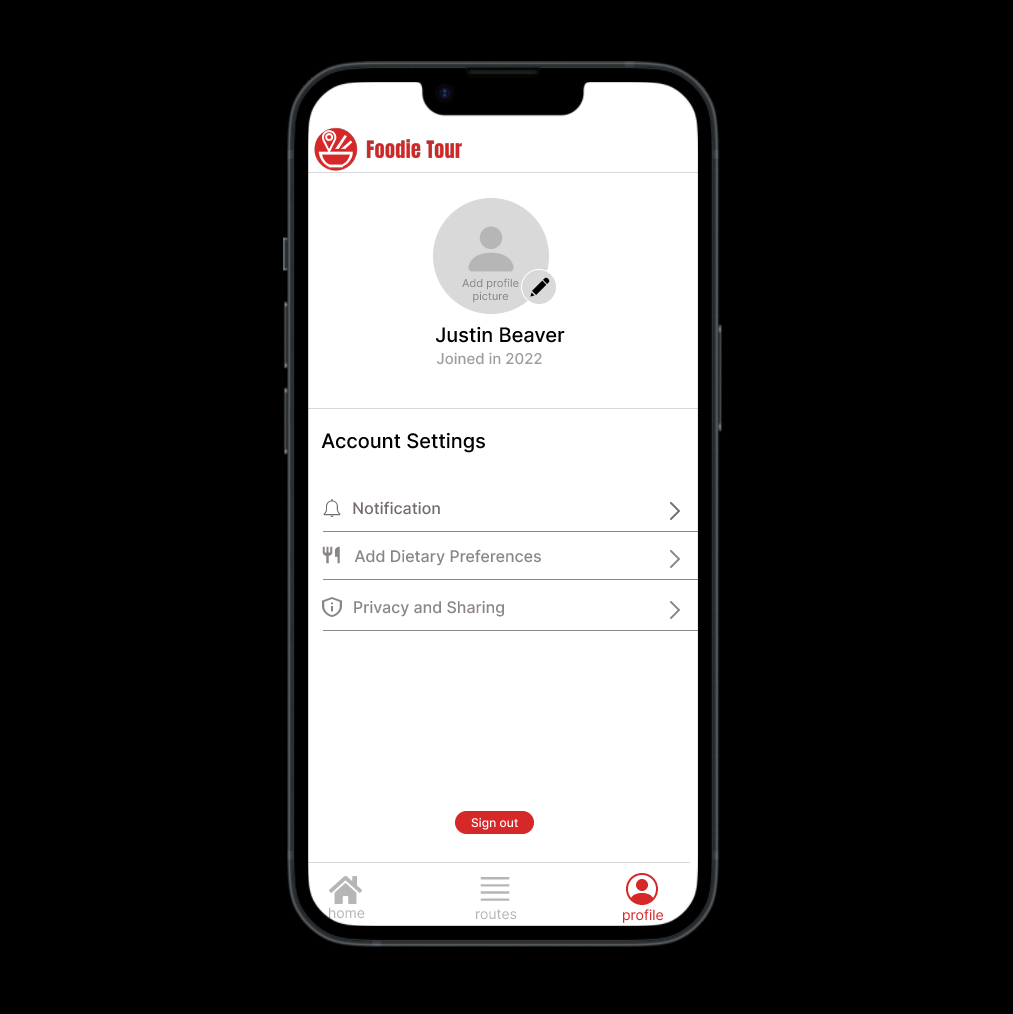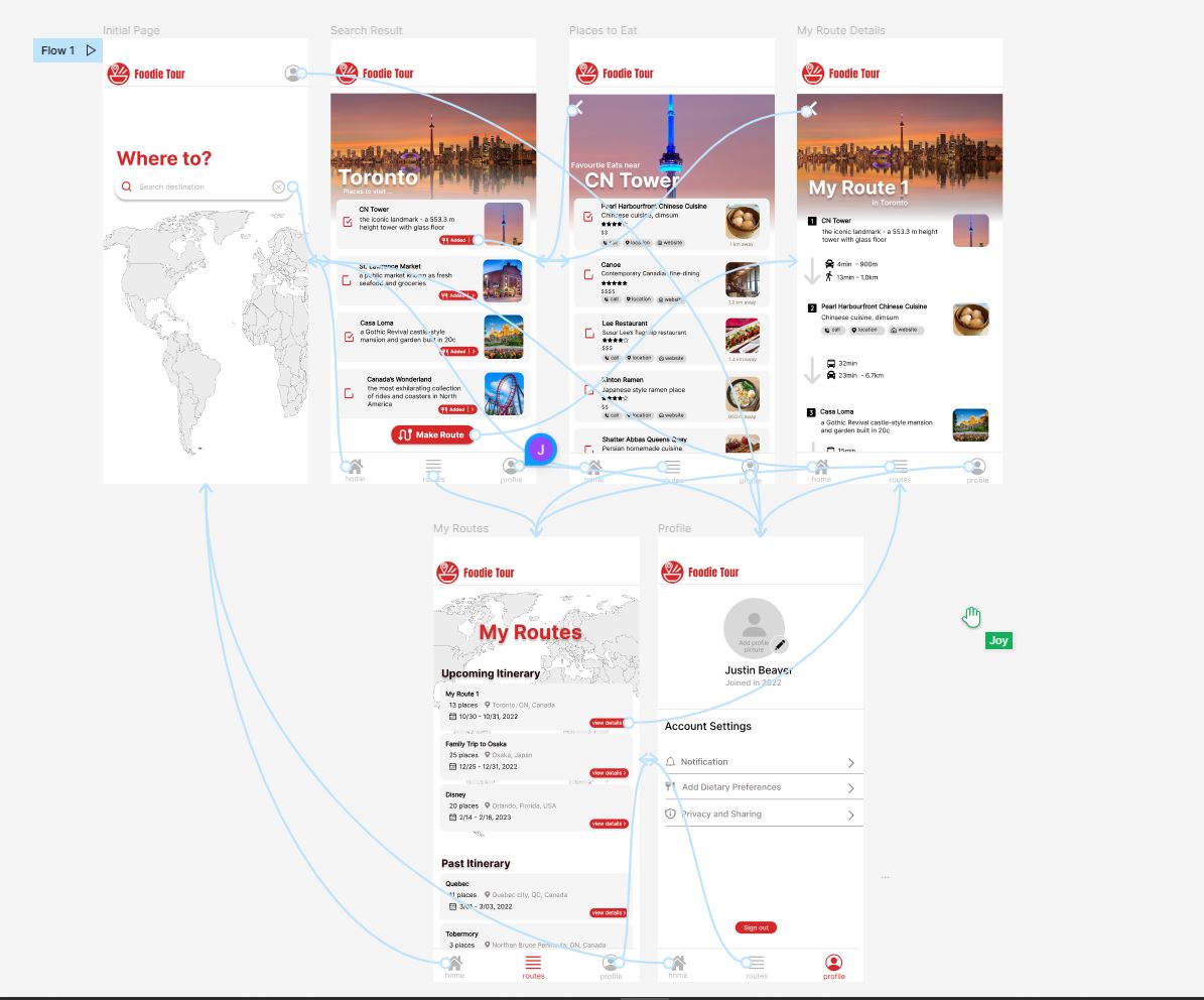 We had come to imagine an app that satisfies people who love to travel and seek gourmet food. We conducted a brief mind-map meeting and sketched ideas to decide what would be the main function of our app by drawing rough wireframes. We built the main page first, which takes users' input by entering the destination the user wants to go to. Based on that main page, we built other pages accordingly. The next page that we built is a page as 'Search Result' which shows a list of tourist attractions. To interact with this page, we designed another page called 'Places to Eat'. This page is prompted when the user clicks an attraction. This page was built to present places to eat nearby the selected tourist attraction. As details, we added review stars, a dollar sign to show its affordability, a button to call the restaurant in case of making a reservation, a button to show its location on a map, and the website of the restaurant. When the user selects all the tourist attractions and places to eat, the app should make the best route how to visit all the places including the restaurants in the most efficient way. Therefore, we built another page called 'My Route Details' to show the user the best route for a particular itinerary. We added features to give detailed but simple information on how to travel between the places. These also provide information on each travel distance, time, and transportation for each route created. Lastly, to overview all the routes that the user has created so far, we made 'My Routes' page which allows users to view records of past travel routes as well as plans for future travel routes.
