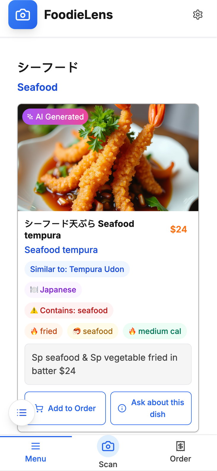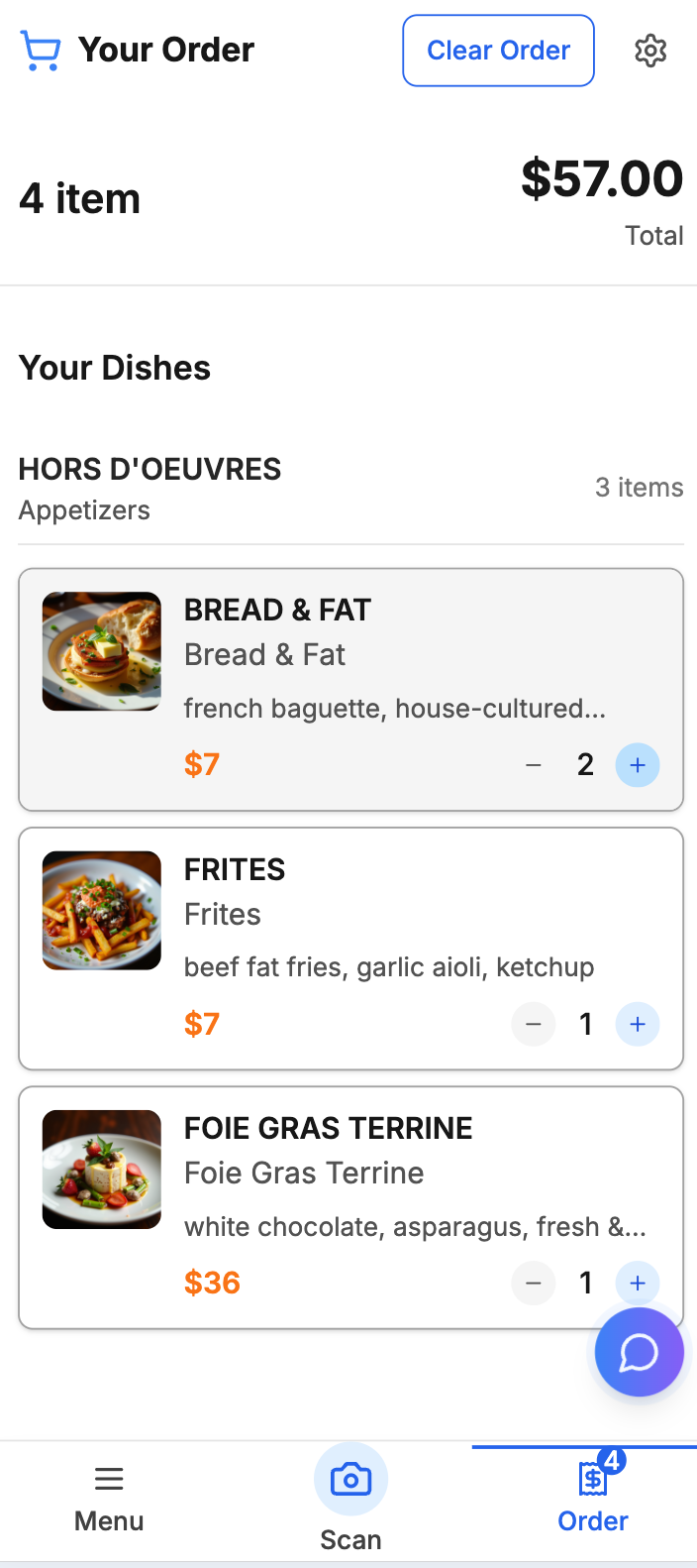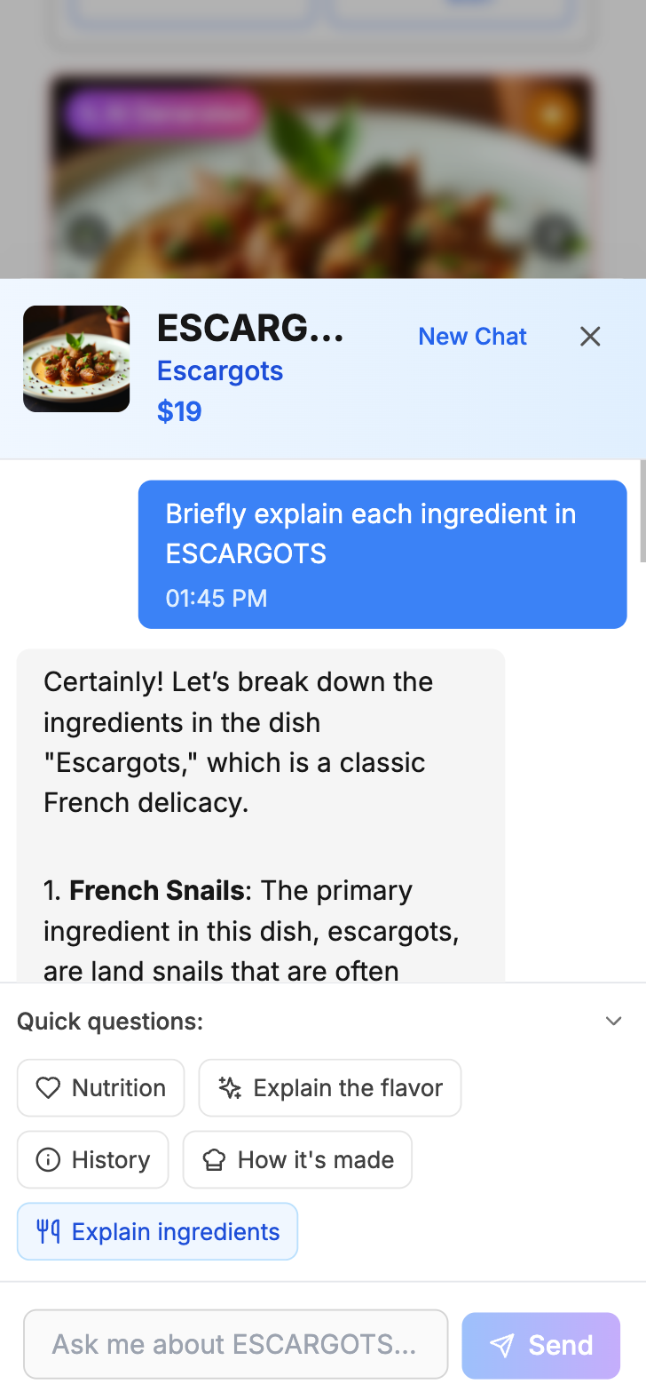 - AI‑generated dish images and an embedded LLM for quick Q&A about any dish or the overall order.